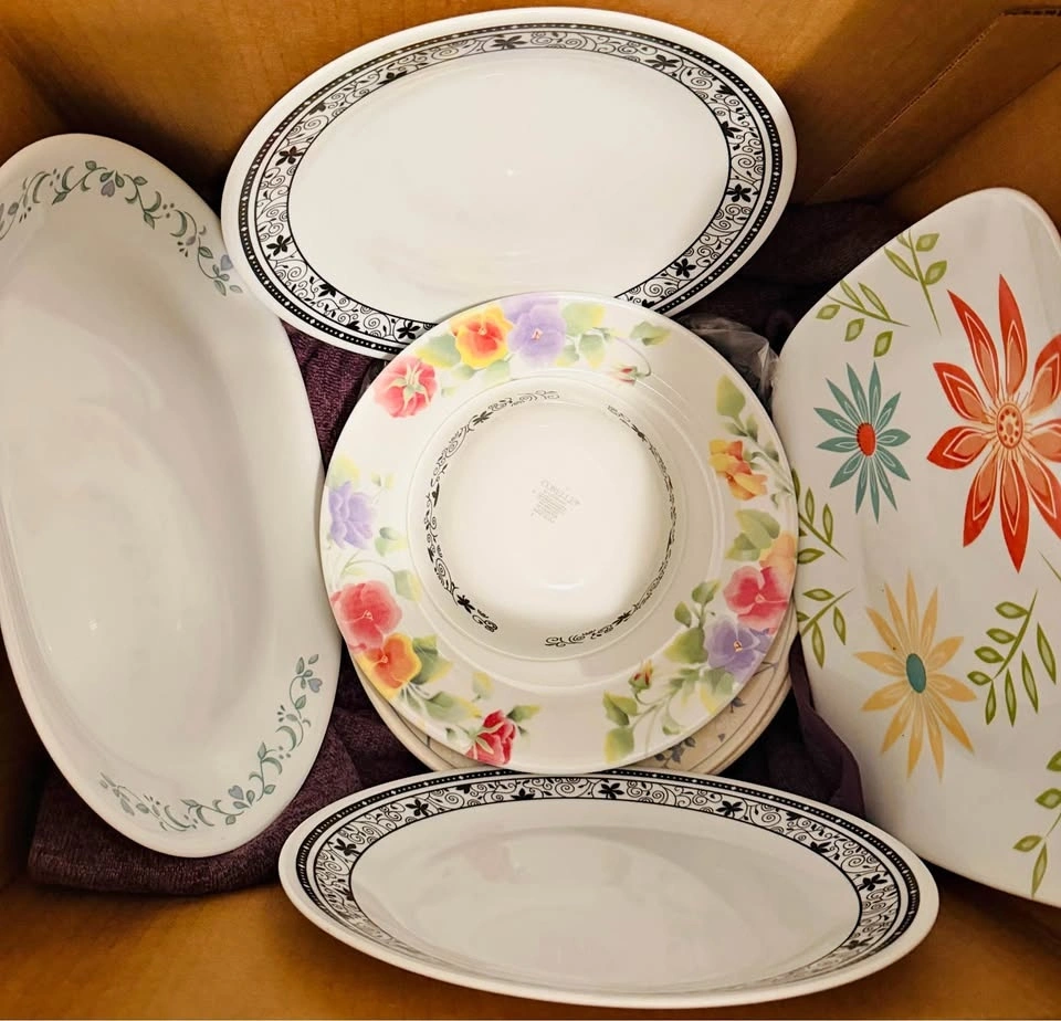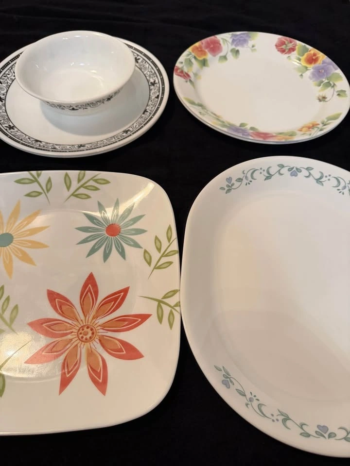 Corelle Collection (Durable & Lightweight): β€’ 4 Corelle dinner plates β€’ 1 matching Corelle bowl β€’ 2 large Corelle serving plates β€’ Extremely durable and lightweight β€’ No scratches, chips, dents, or damage Additional Plates (Non-Corelle): β€’ 3 floral print plates β€’ Lightweight & dishwasher friendly β€’ Perfect for everyday use or serving βœ”οΈ Clean and well-maintained βœ”οΈ Ideal for daily meals or hosting πŸ“ Pickup: SW Calgary