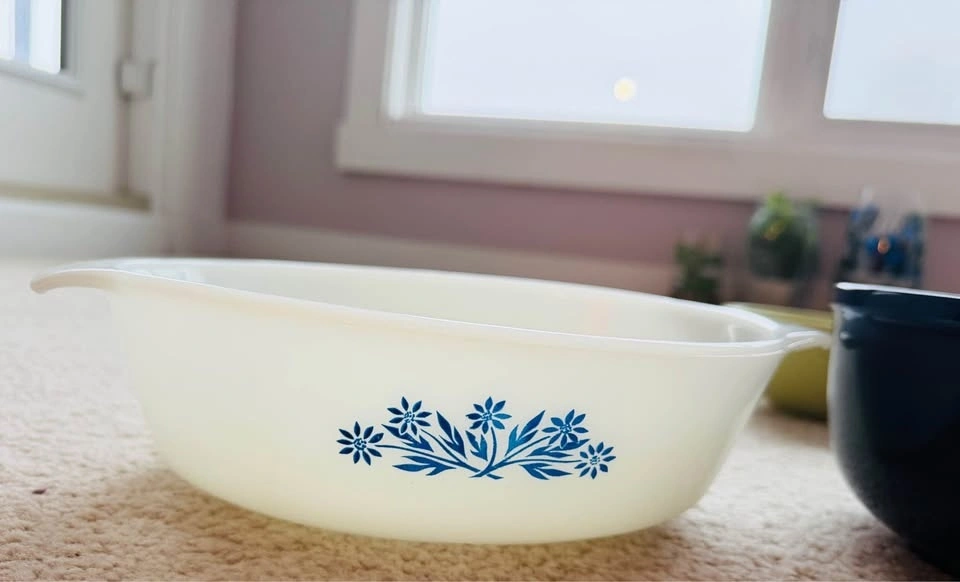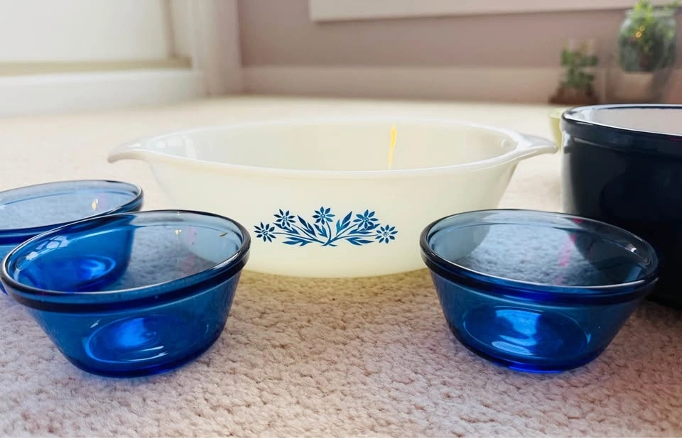 Includes 1 big serving bowl with matching blue small bowls