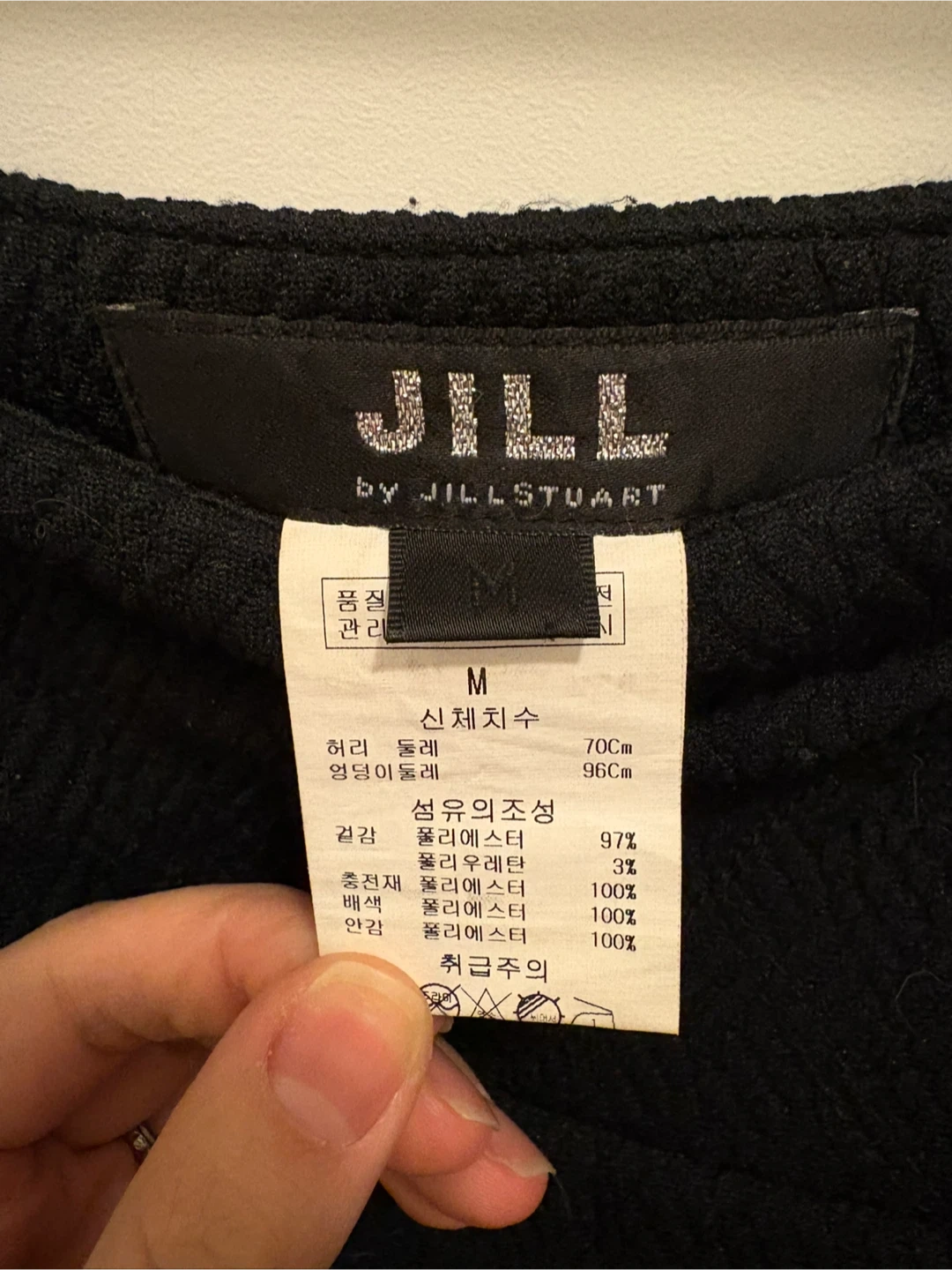 Selling a cute navy skirt from JILL by JILLSTUART. It's a size M. The waist measures 70cm and the hips measure 96cm. The material is 97% polyester and 3% polyurethane.