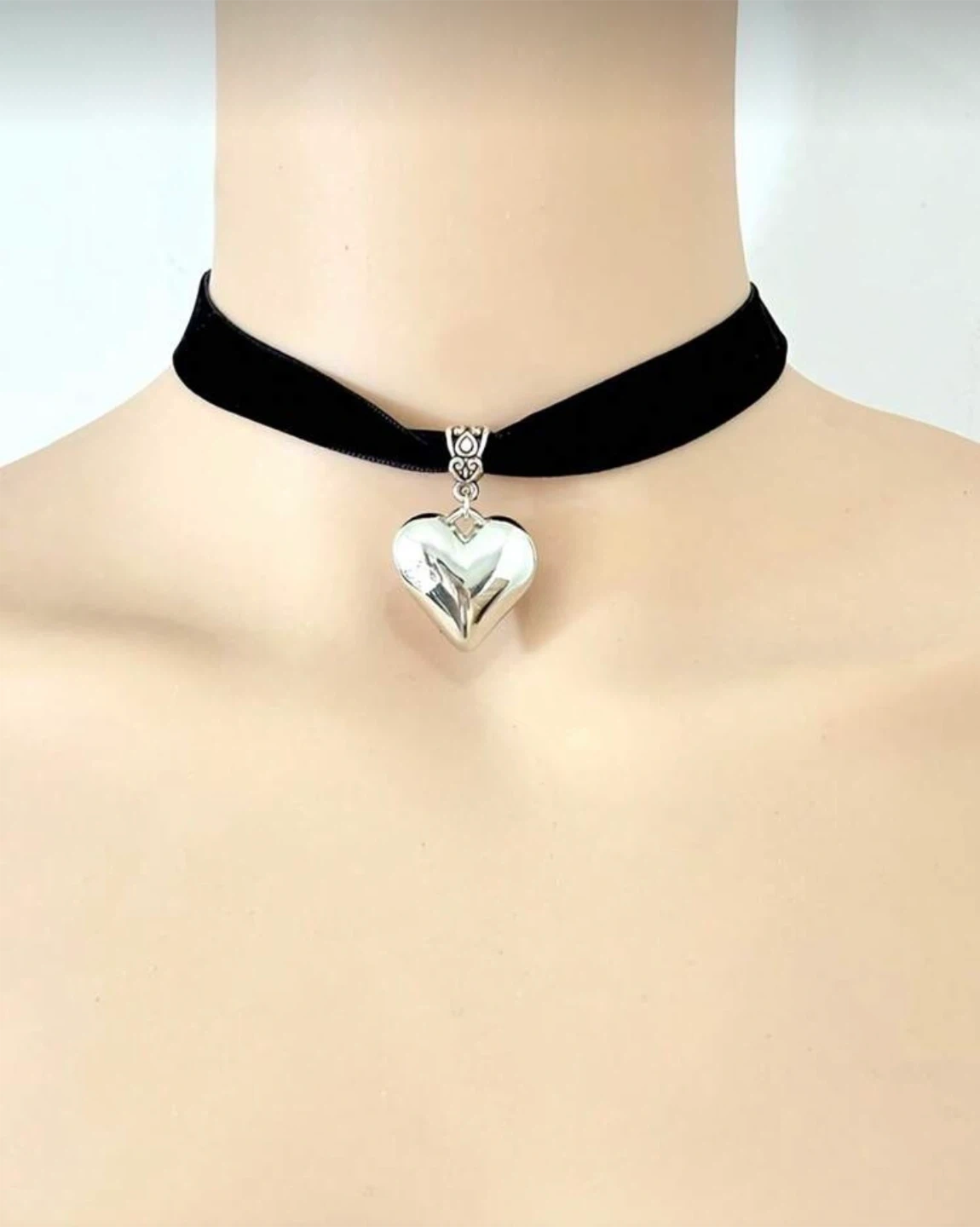 This is a black velvet choker with a silver heart pendant. It's in great condition and would be a cute addition to any outfit!