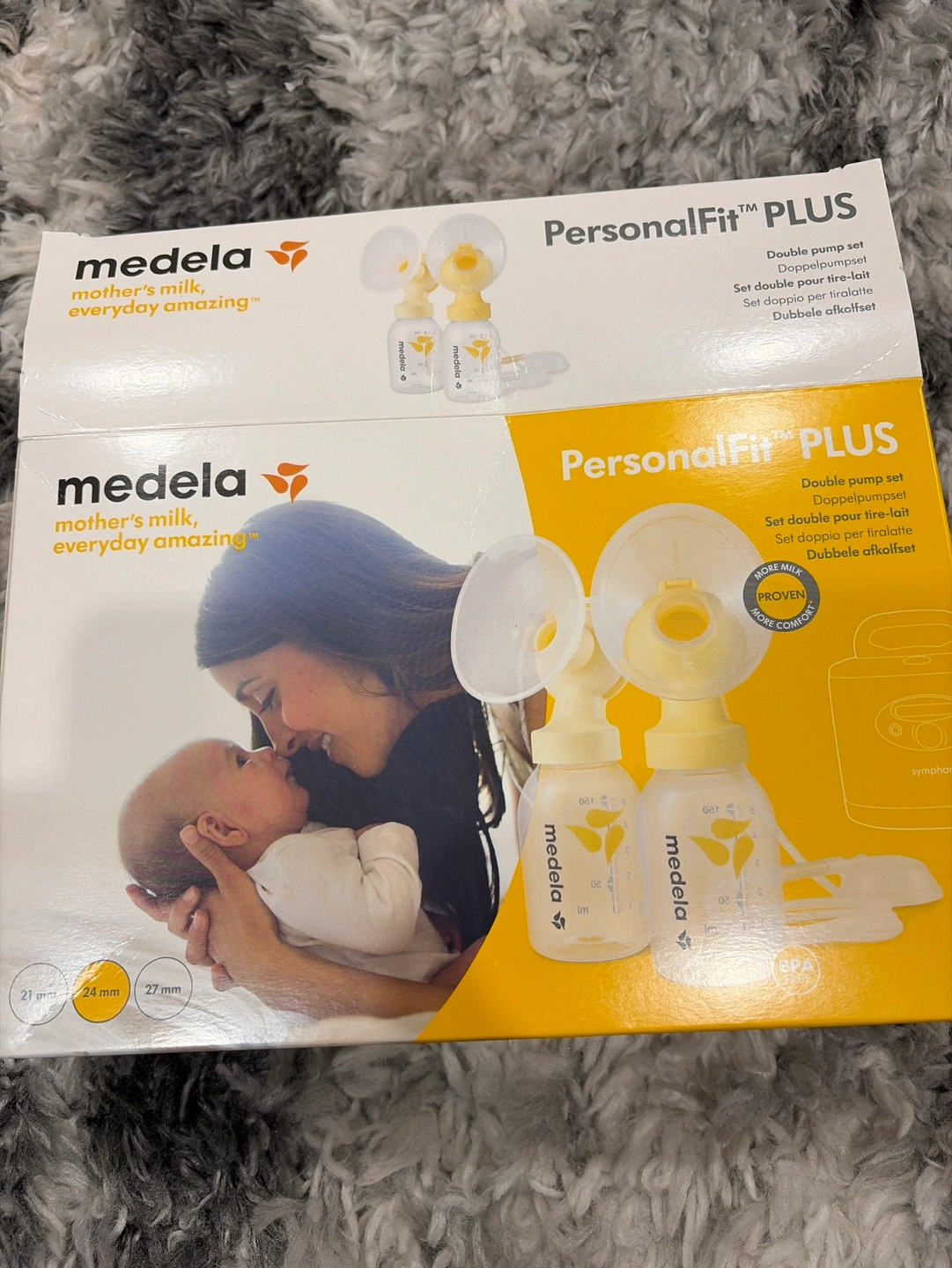 Selling good condition Medela PersonalFit PLUS double pump set! This set is designed for more milk and proven more comfort. It includes different sizes: 21 mm, 24 mm, and 27 mm. Perfect for new moms!