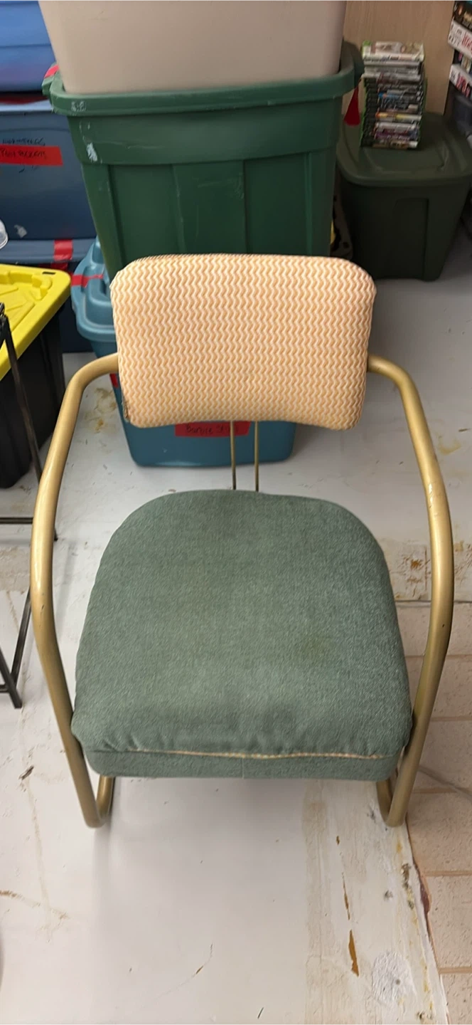 Selling a charming vintage accent chair with a unique design! It features a green upholstered seat and backrest complemented by a gold-tone metal frame. Perfect for adding a touch of retro style to any room