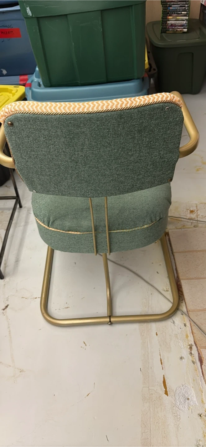 Selling a charming vintage accent chair with a unique design! It features a green upholstered seat and backrest complemented by a gold-tone metal frame. Perfect for adding a touch of retro style to any room