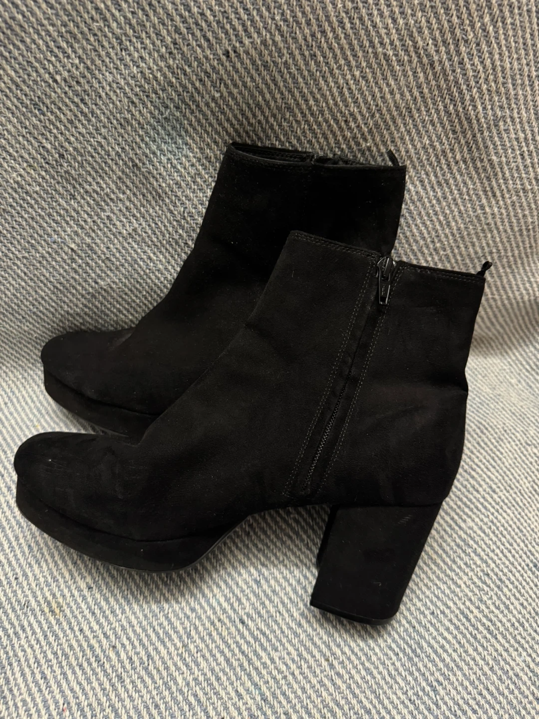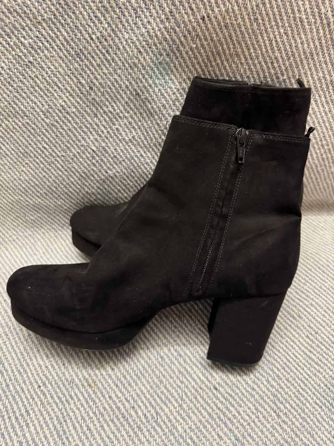 Selling a pair of H&M black ankle boots in US size 8. These boots feature a side zipper and a chunky heel. They are made of a suede-like material. The boots are clean with no damage.