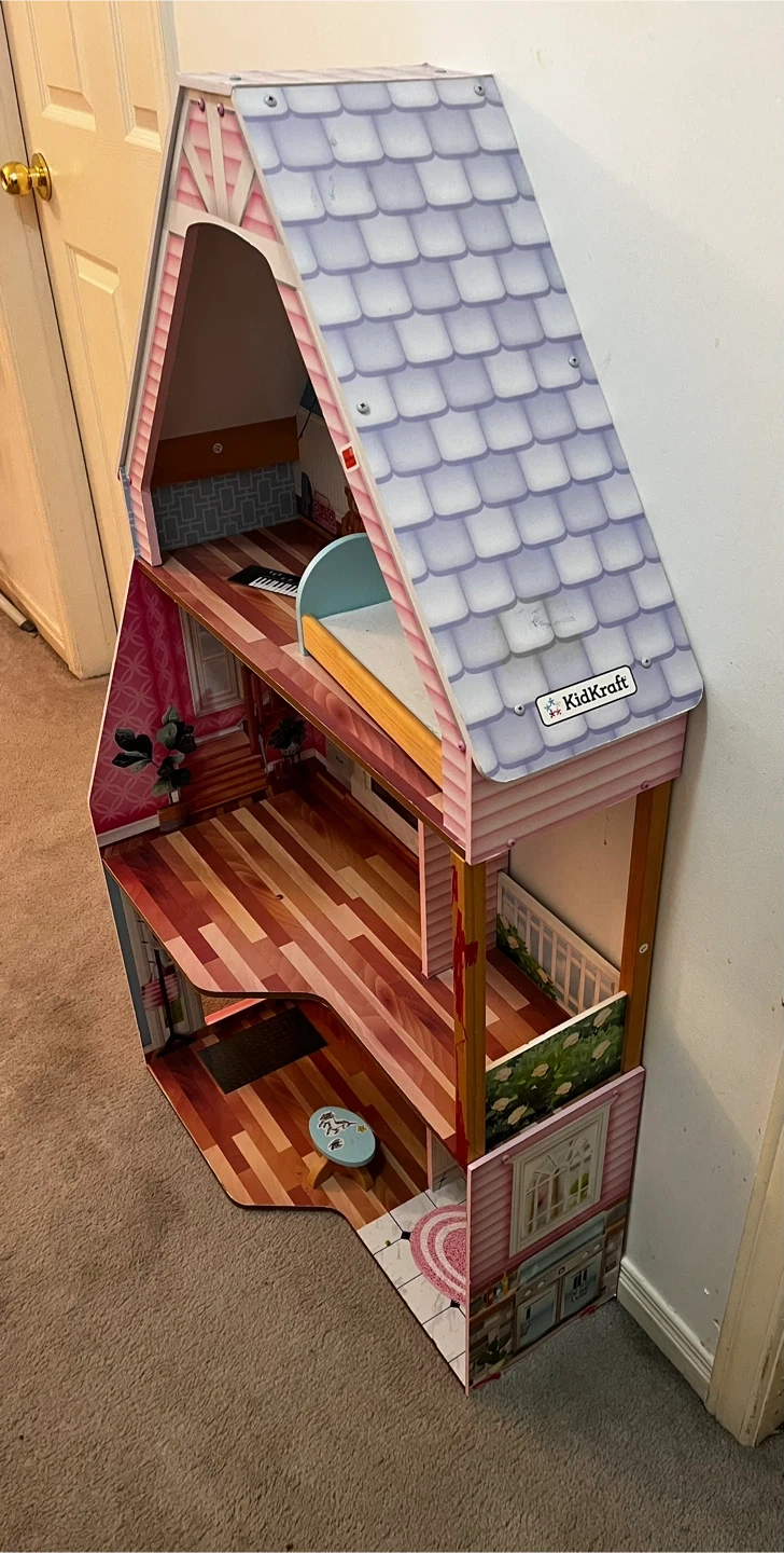 Selling a lovely KidKraft dollhouse in good condition! It's pink and white, and ready for a new family of dolls to move in. It has multiple levels for hours of fun! A door to open and lots of fun interior to use imagination to be as creative as possible. Comes with a bed and table.