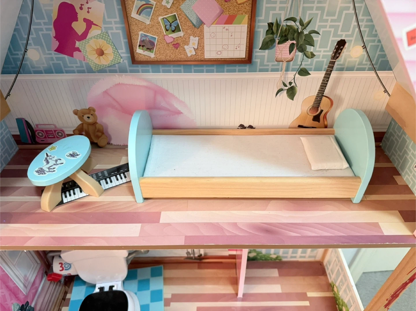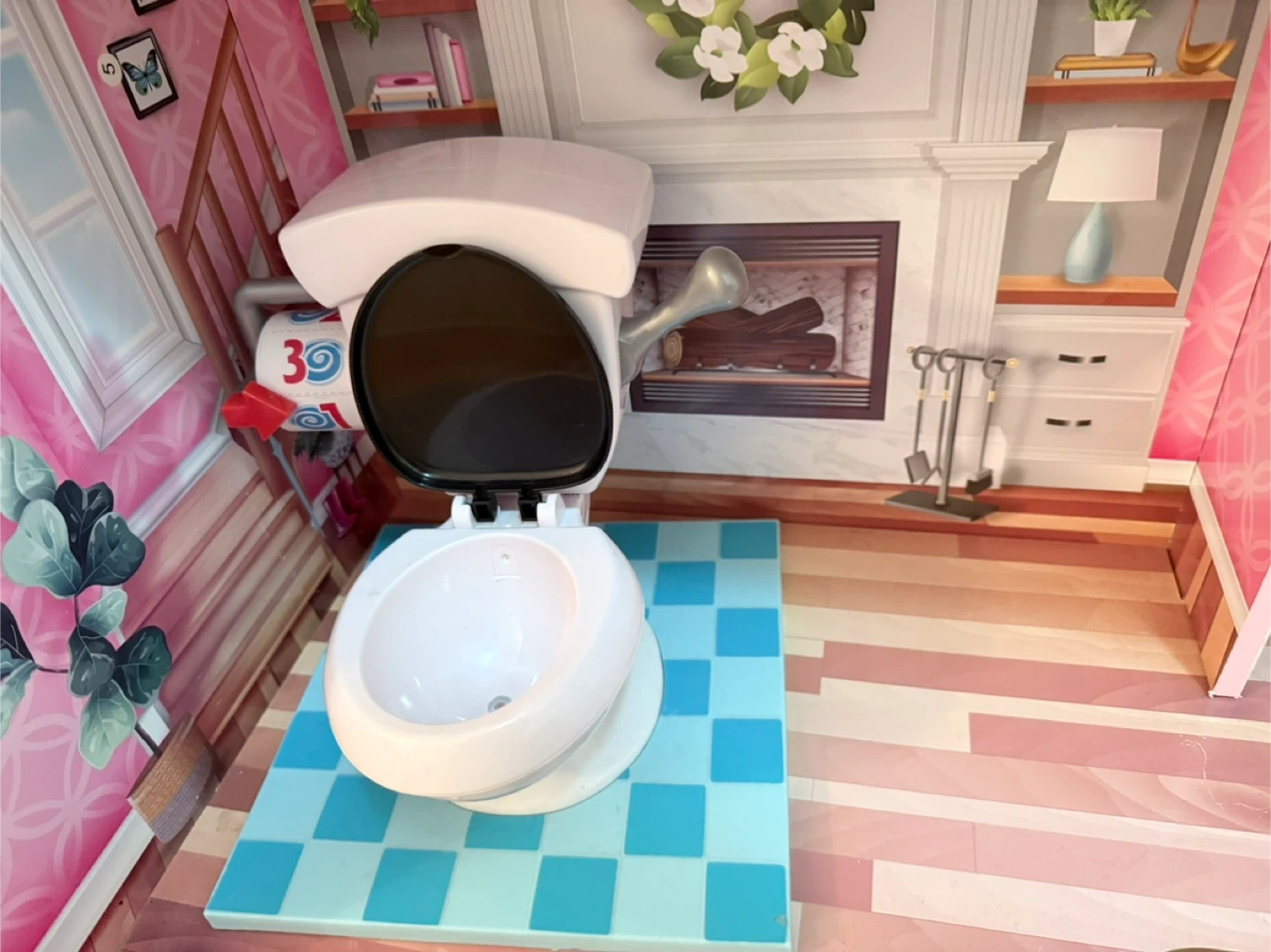 Comes with a bed and a toilet seat that makes flushing sounds.