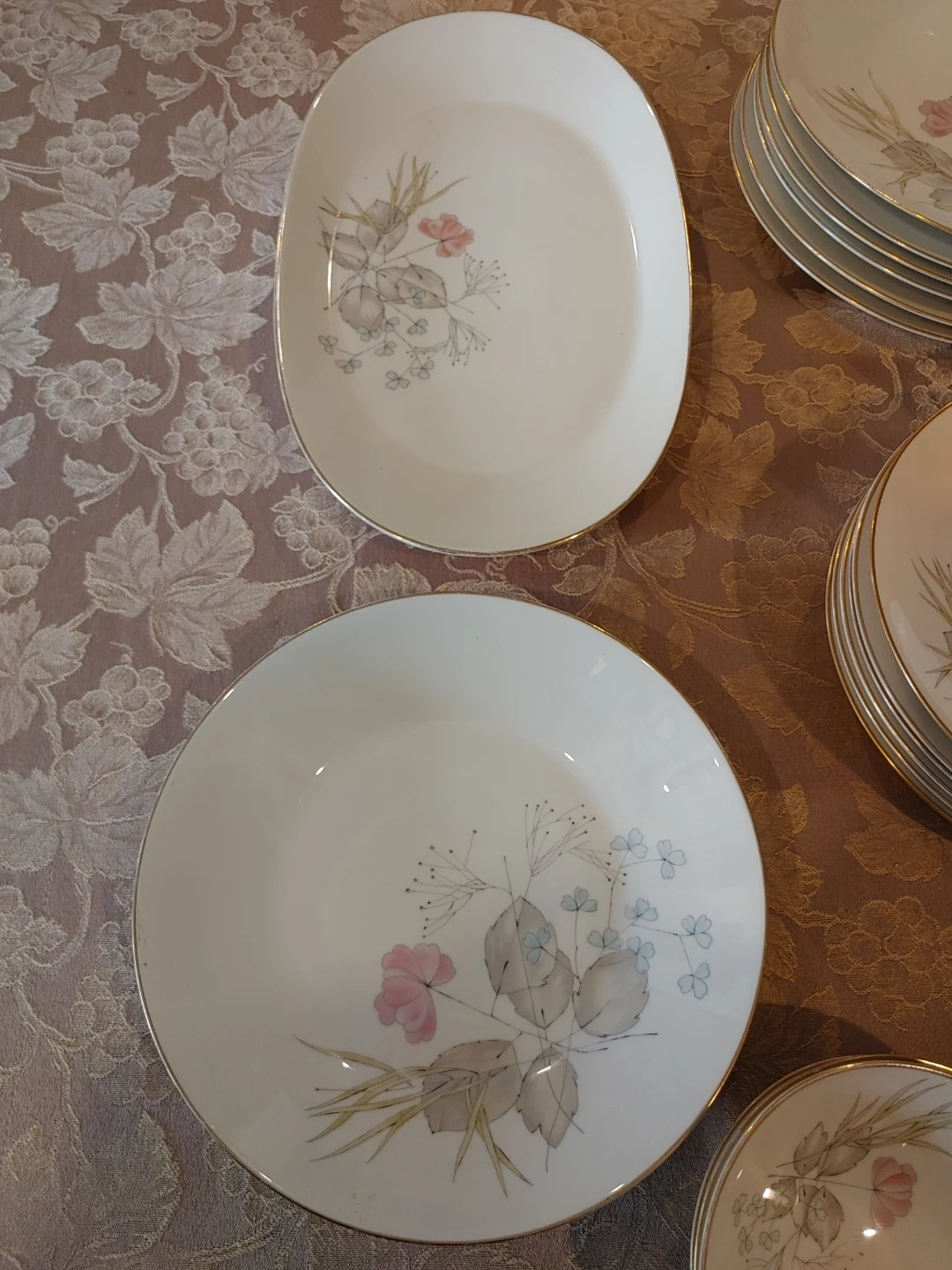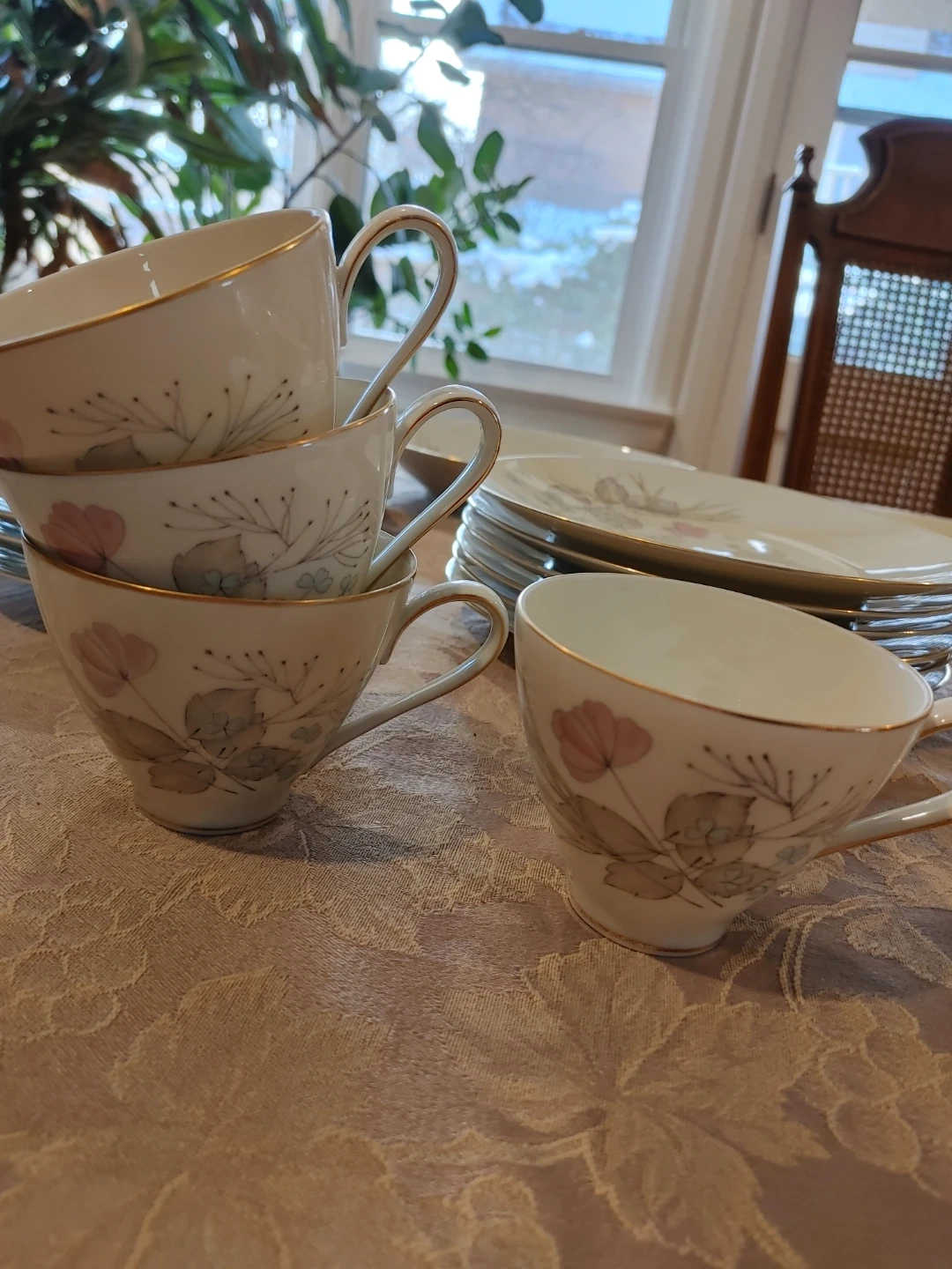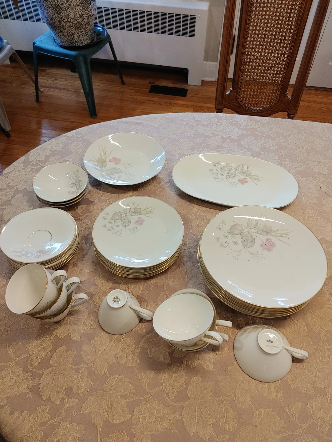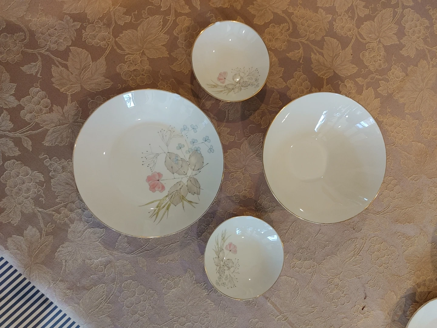 Selling a vintage fine china set featuring a delicate floral design. This set includes plates, bowls, cups, saucers, a creamer, and a sugar bowl. Perfect for adding a touch of elegance to your dining experience!