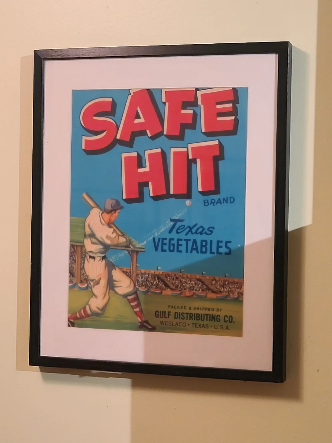 Selling a framed print featuring a vintage baseball theme with "Safe Hit Brand Texas Vegetables" printed on it. The print is packed and shipped by Gulf Distributing Co. in Weslaco, Texas, USA. It would look great in a kitchen or rec room!