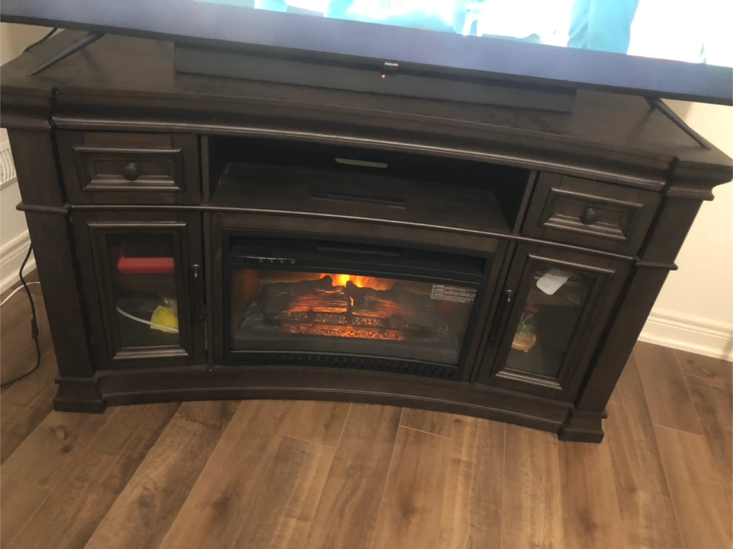 Selling a TV stand with an electric fireplace insert. It's in very good condition and adds a cozy touch to any living room. Perfect for those chilly evenings!