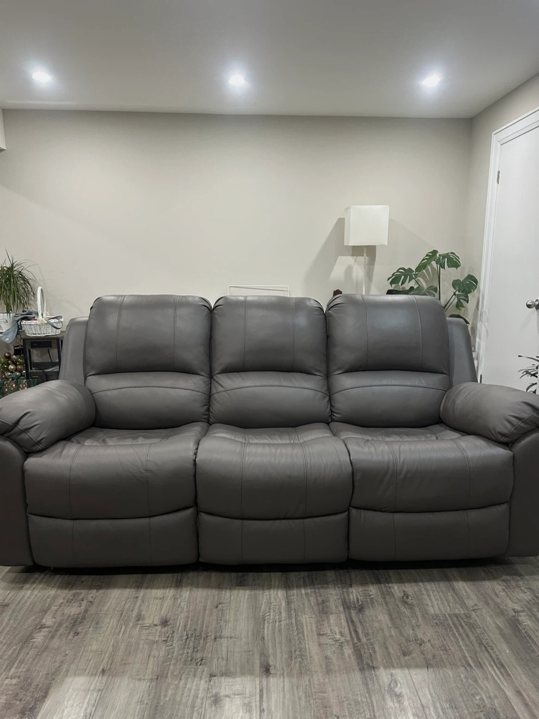Selling a grey Alba Leather Power Reclining Sofa! It's a comfy and stylish addition to any living room. The power reclining feature makes it perfect for relaxing after a long day. It's in great condition and ready for a new home!