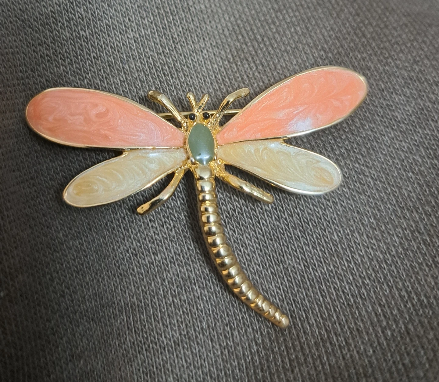 This is a lovely dragonfly brooch with a gold-tone finish. The wings feature a beautiful combination of peach and cream enamel with an elegant green(Jade maybe) stone in the middle. It's perfect for adding a touch of whimsy to any outfit!