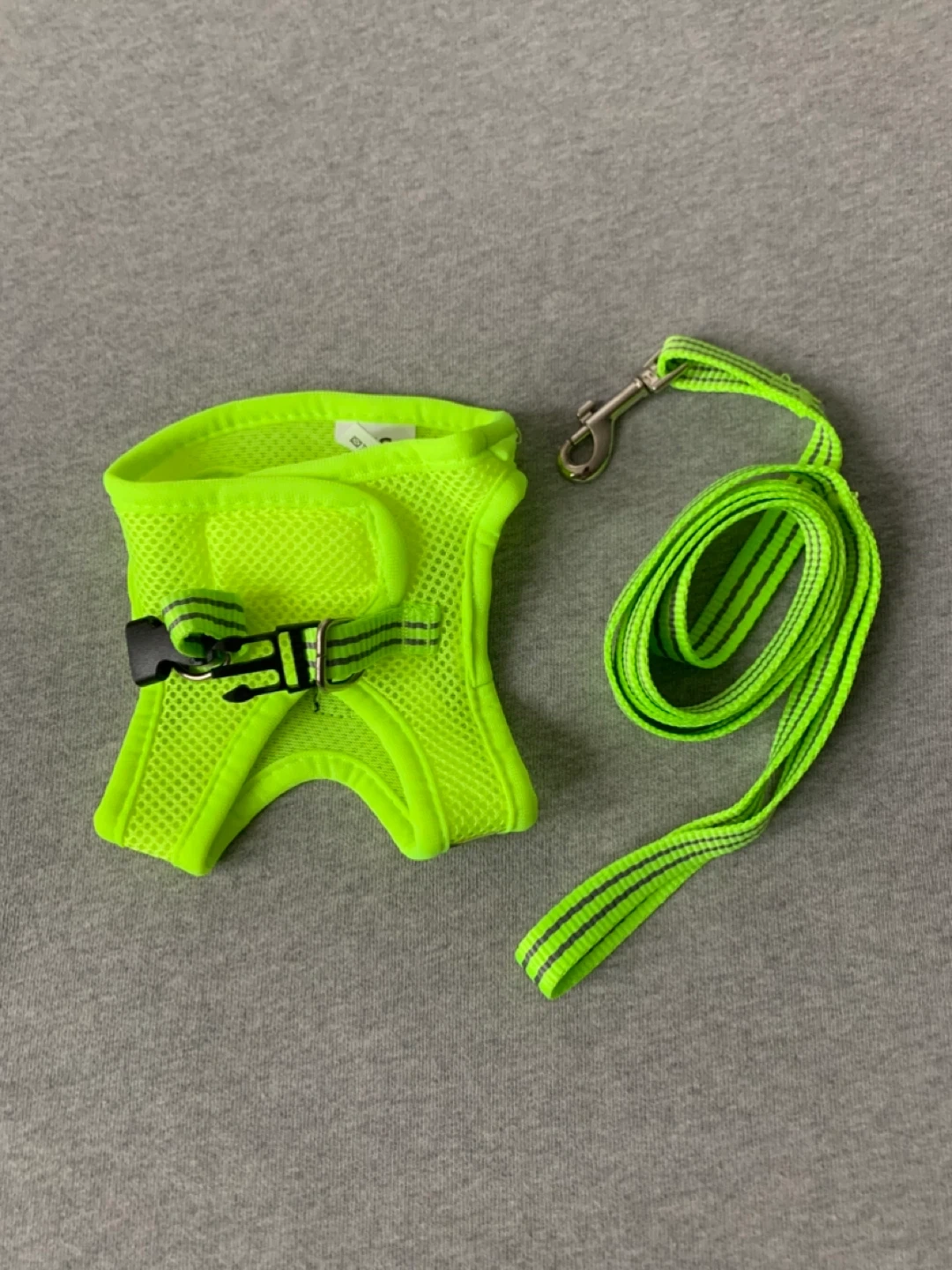 Fluorescent vibrant neon green colour. Perfect for small dogs or puppies. Comes with both the harness and matching leash.