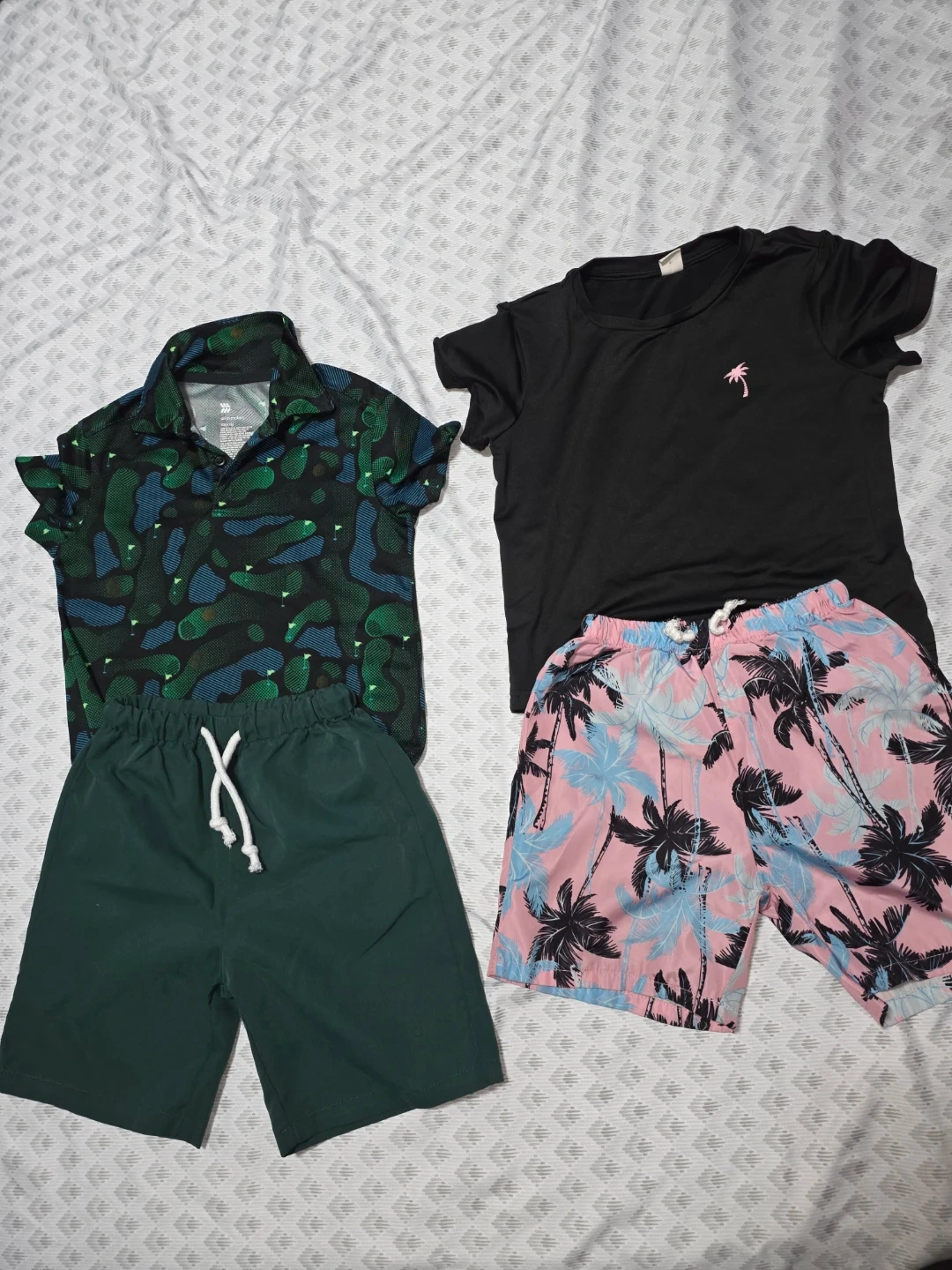 Selling a bundle of boys' clothing size 5! Includes a patterned polo shirt, a black t-shirt with a palm tree design, a pair of solid green shorts, and a pair of pink and blue palm tree print shorts. Perfect for summer!