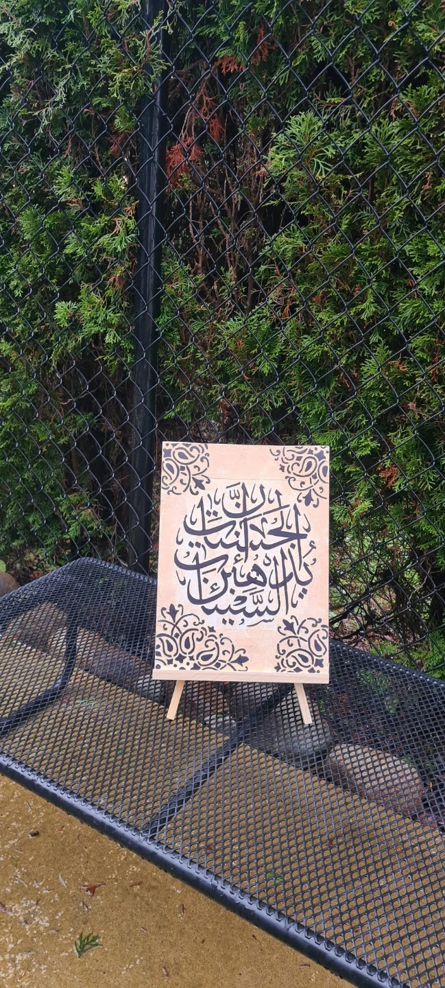 Beautiful handmade piece of Islamic calligraphy art on canvas. It comes with a small easel stand, perfect for displaying on a desk or shelf. The calligraphy is made with clay in black ink on a beige canvas, with decorative borders. A lovely addition to any home or office!