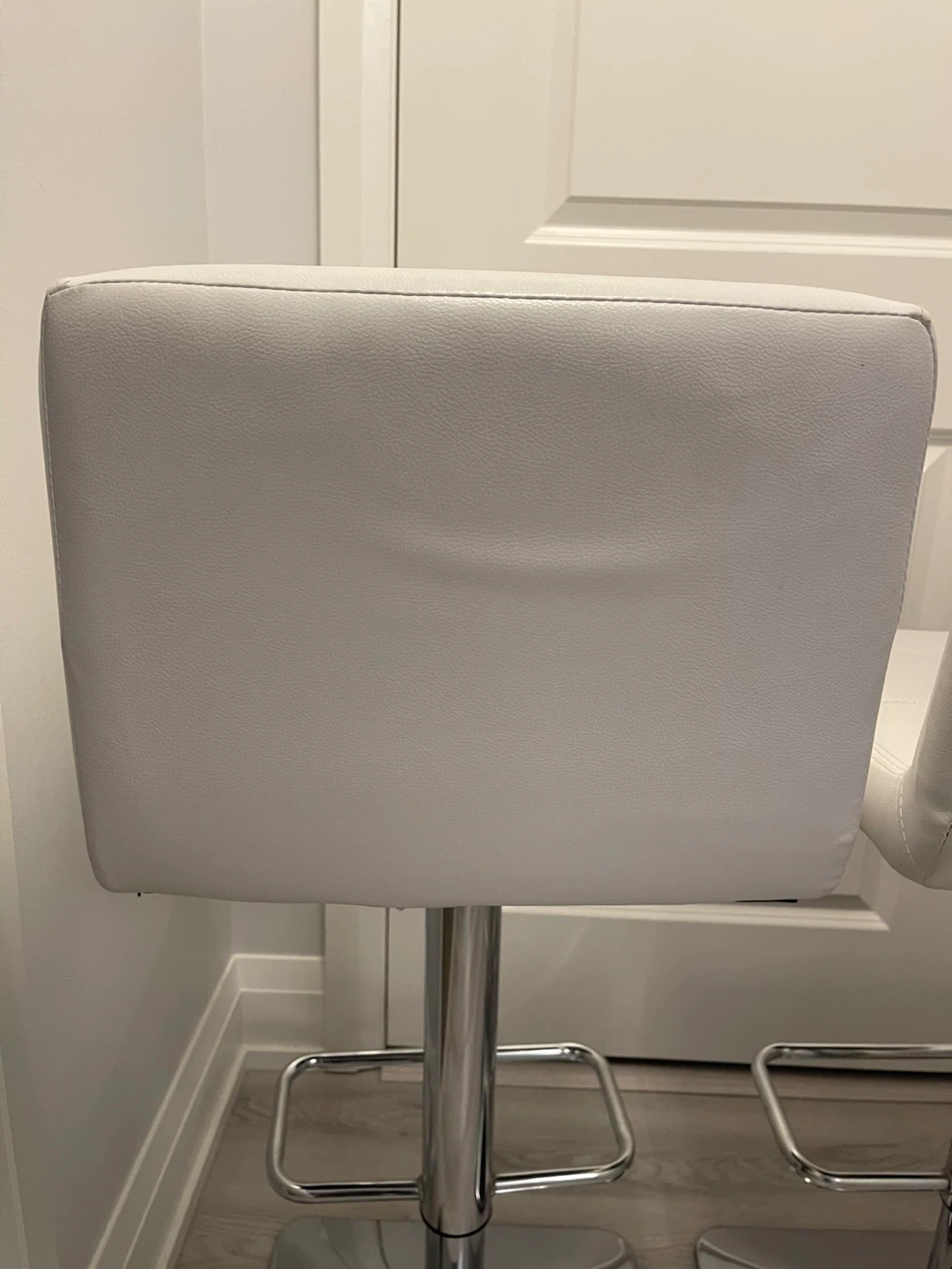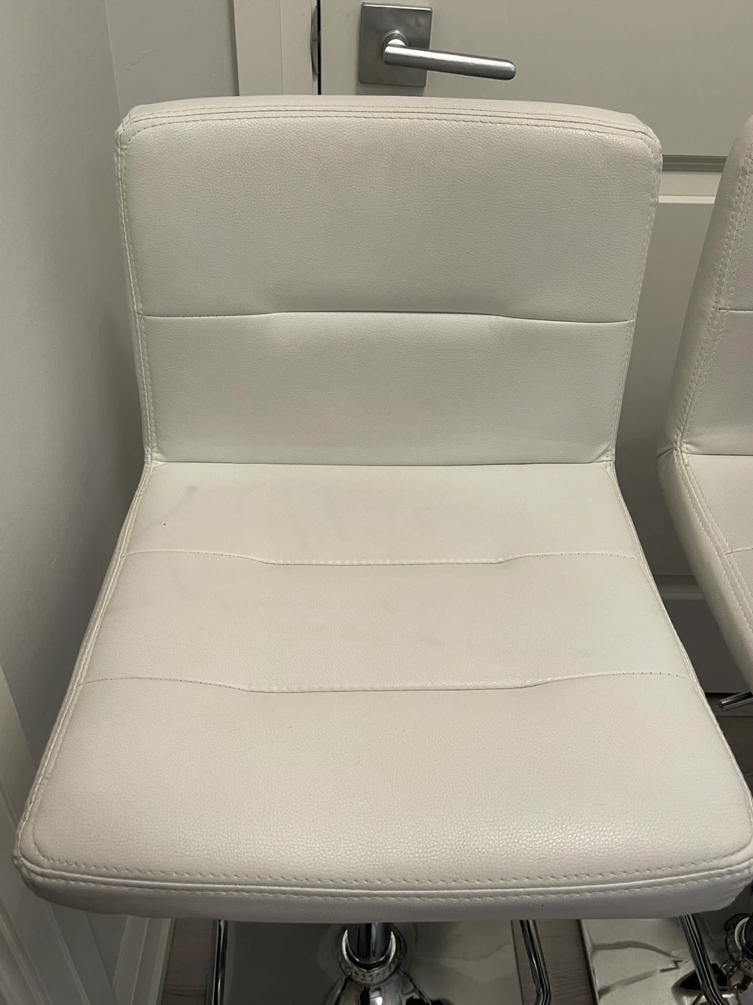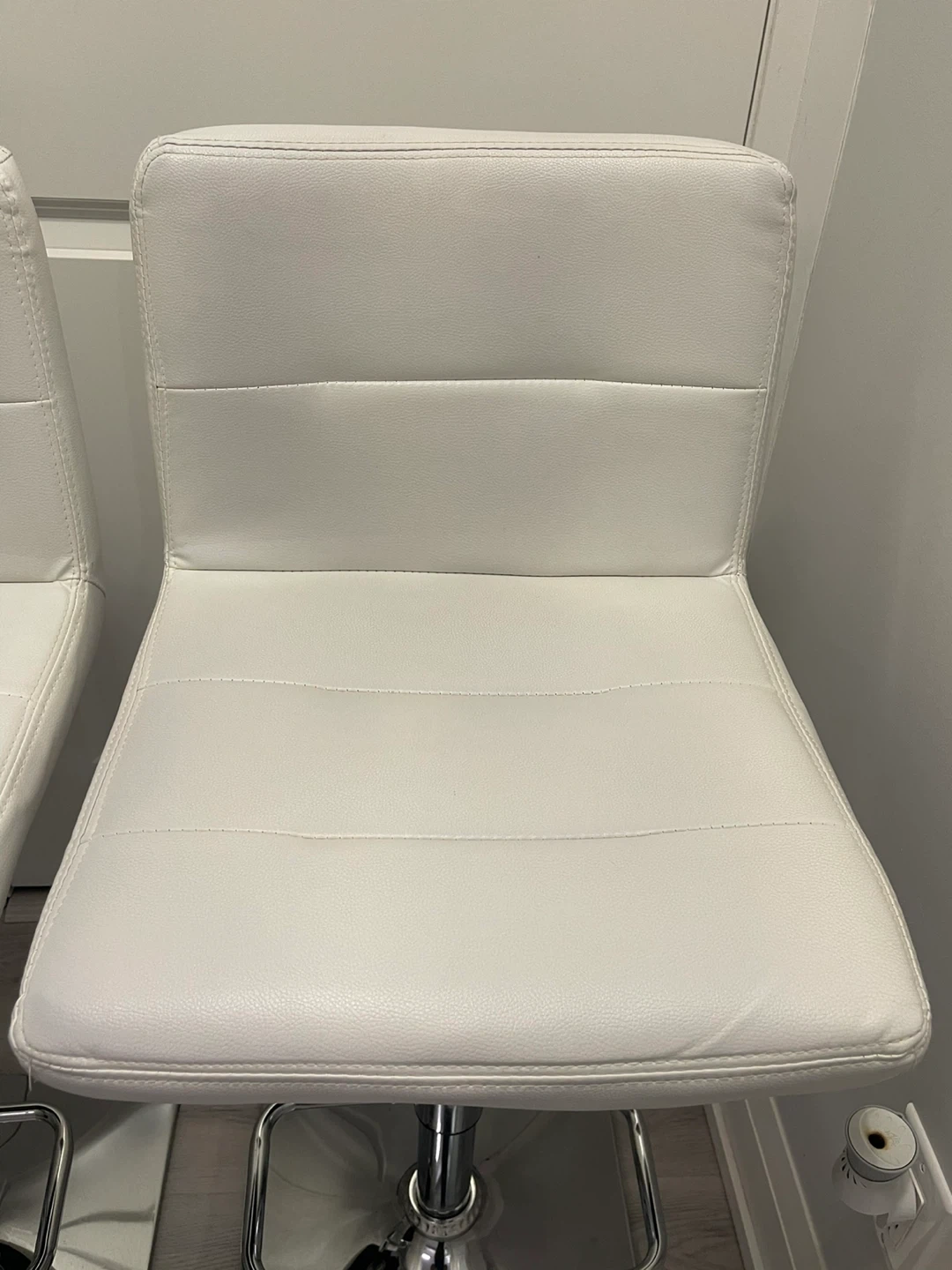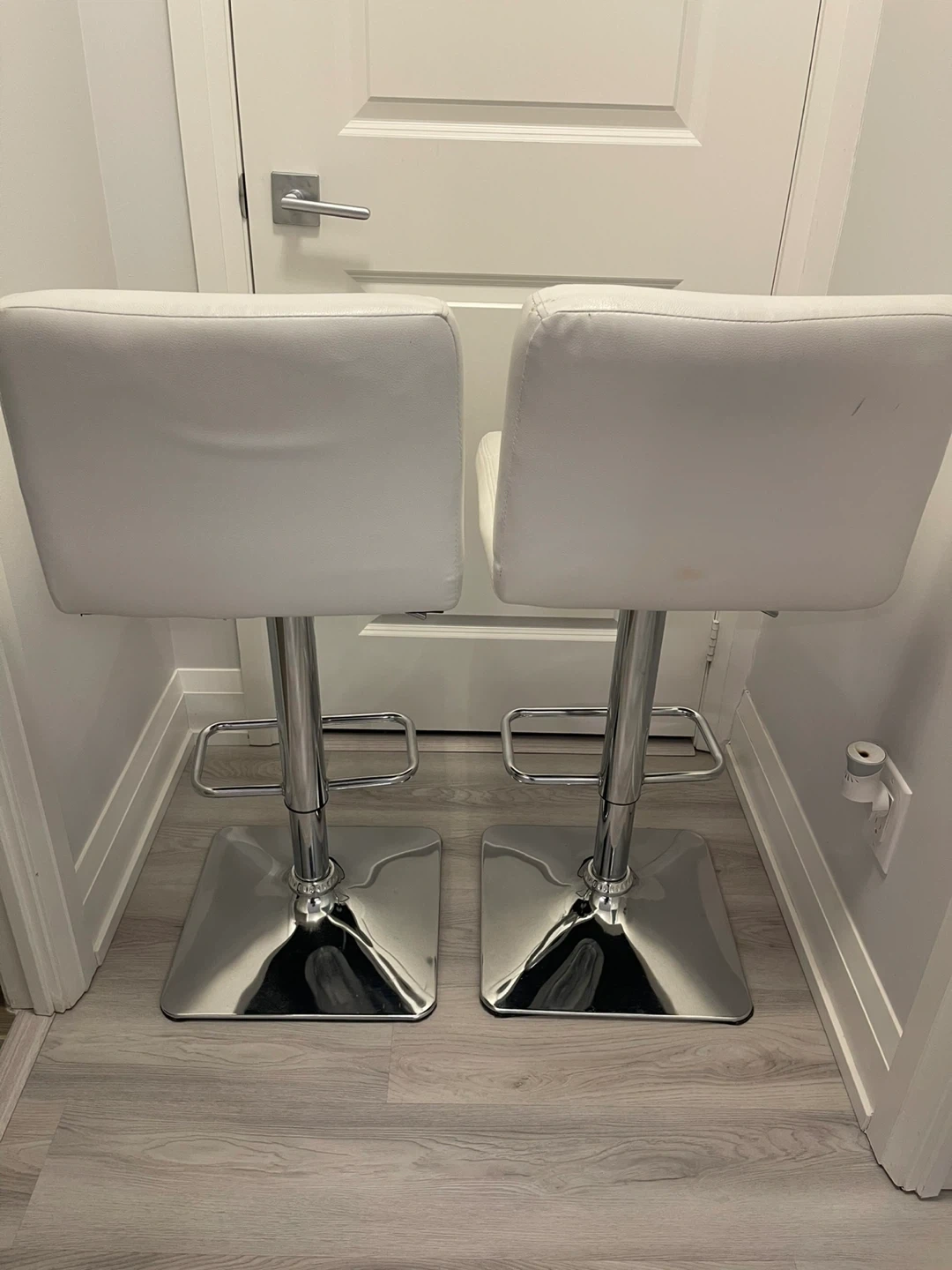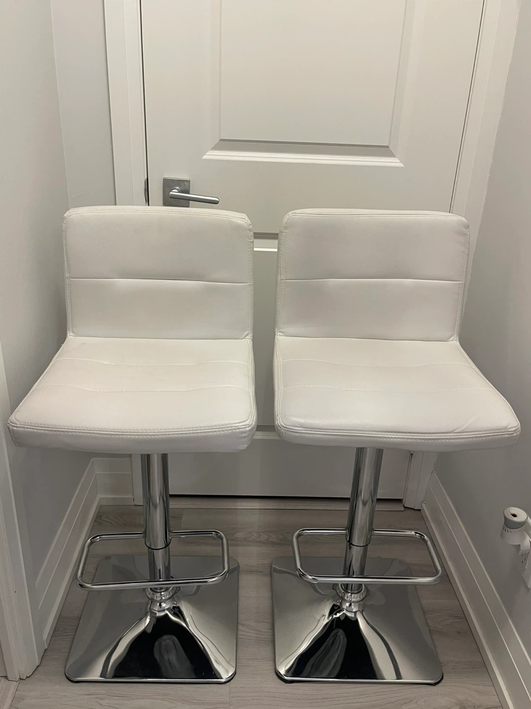 Selling a set of two bar stools! They are white with a chrome base and adjustable height. They're in good condition and would look great in any kitchen or bar area
