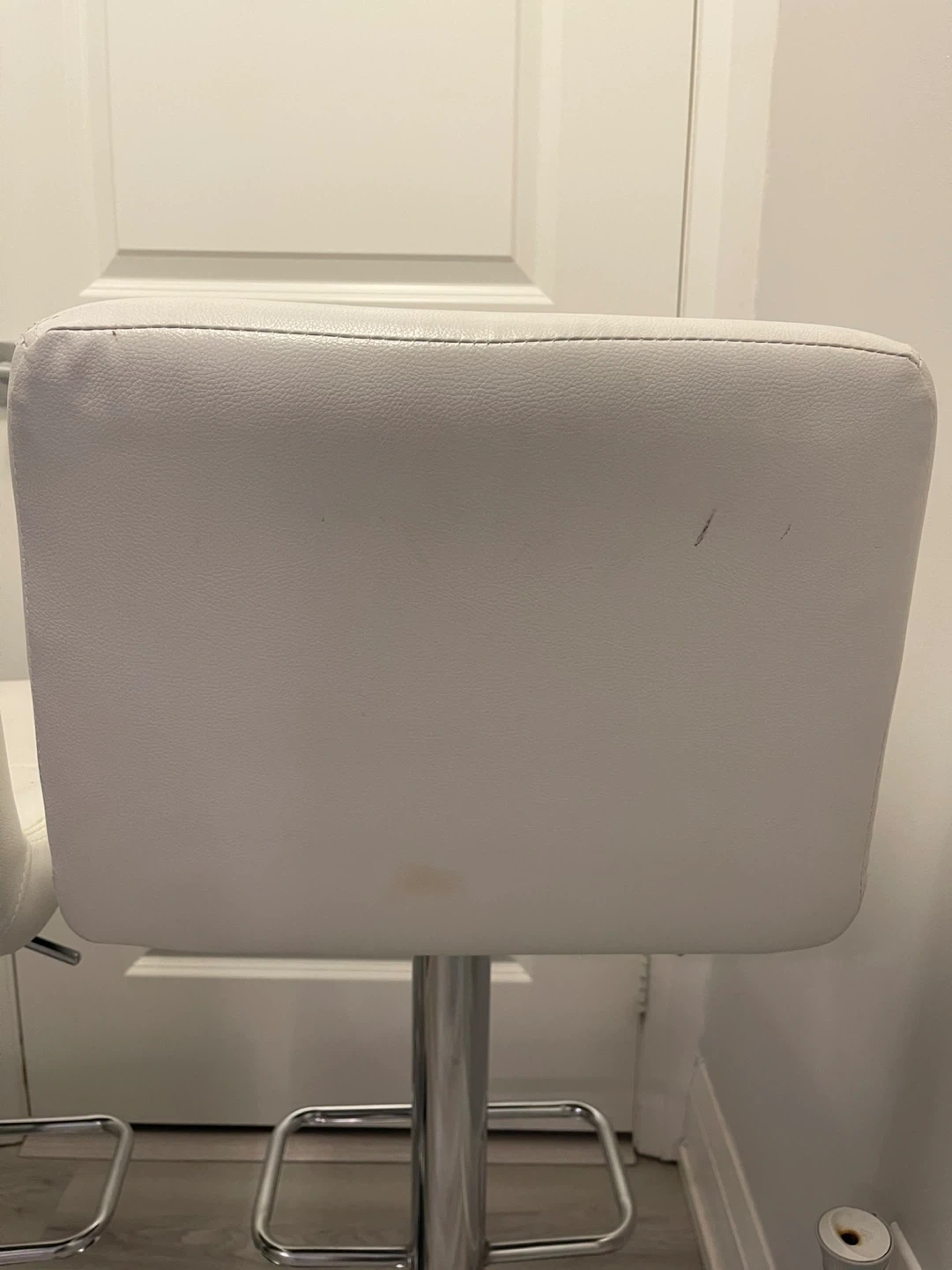 Selling a set of two bar stools! They are white with a chrome base and adjustable height. They're in good condition and would look great in any kitchen or bar area