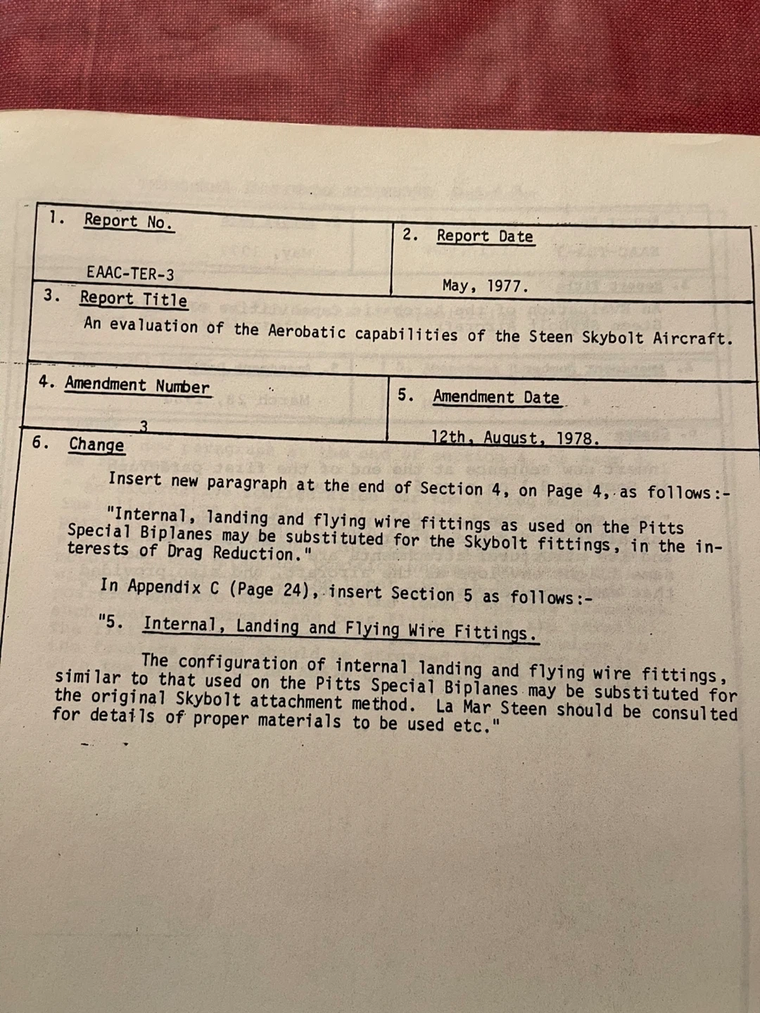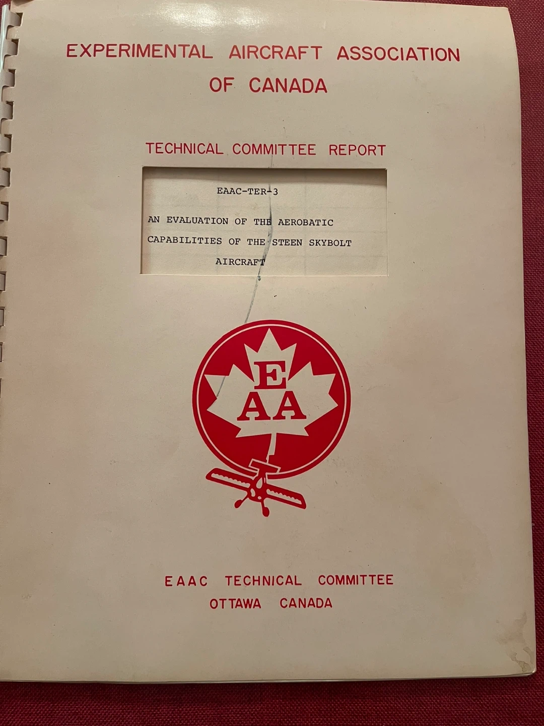 Here's a technical committee report from the Experimental Aircraft Association of Canada. It's an evaluation of the aerobatic capabilities of the Steen Skybolt Aircraft. Report No. EAAC-TER-3, dated May, 1977, with amendments through March 1980. Cash only