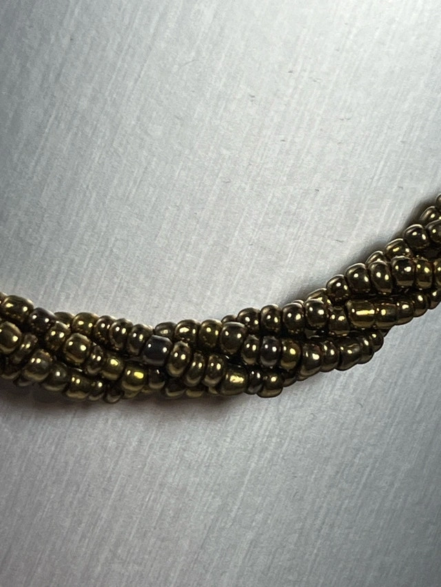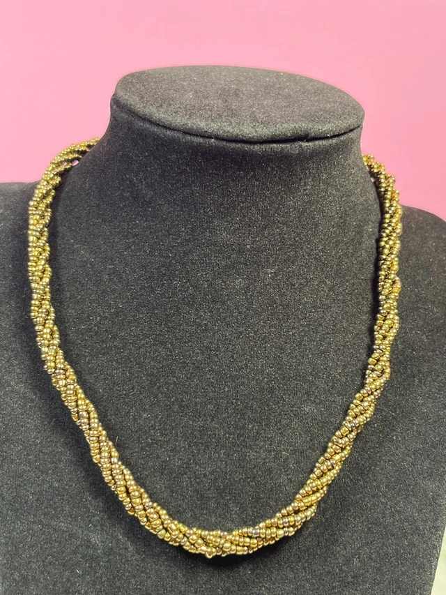 Add a touch of vintage glamour to your look with this stunning, used gold beaded necklace featuring a twisted design, perfect for adding a classic touch to any outfit. This eye-catching piece is in good condition. Here are its details: