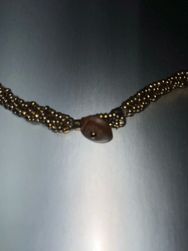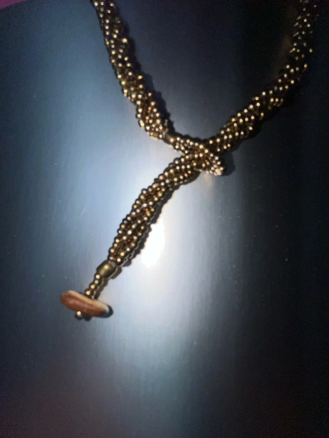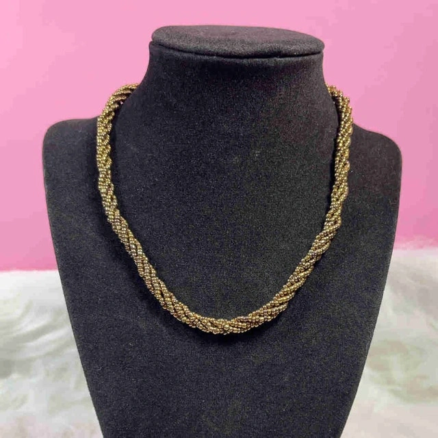 Add a touch of vintage glamour to your look with this stunning, used gold beaded necklace featuring a twisted design, perfect for adding a classic touch to any outfit. This eye-catching piece is in good condition. Here are its details: