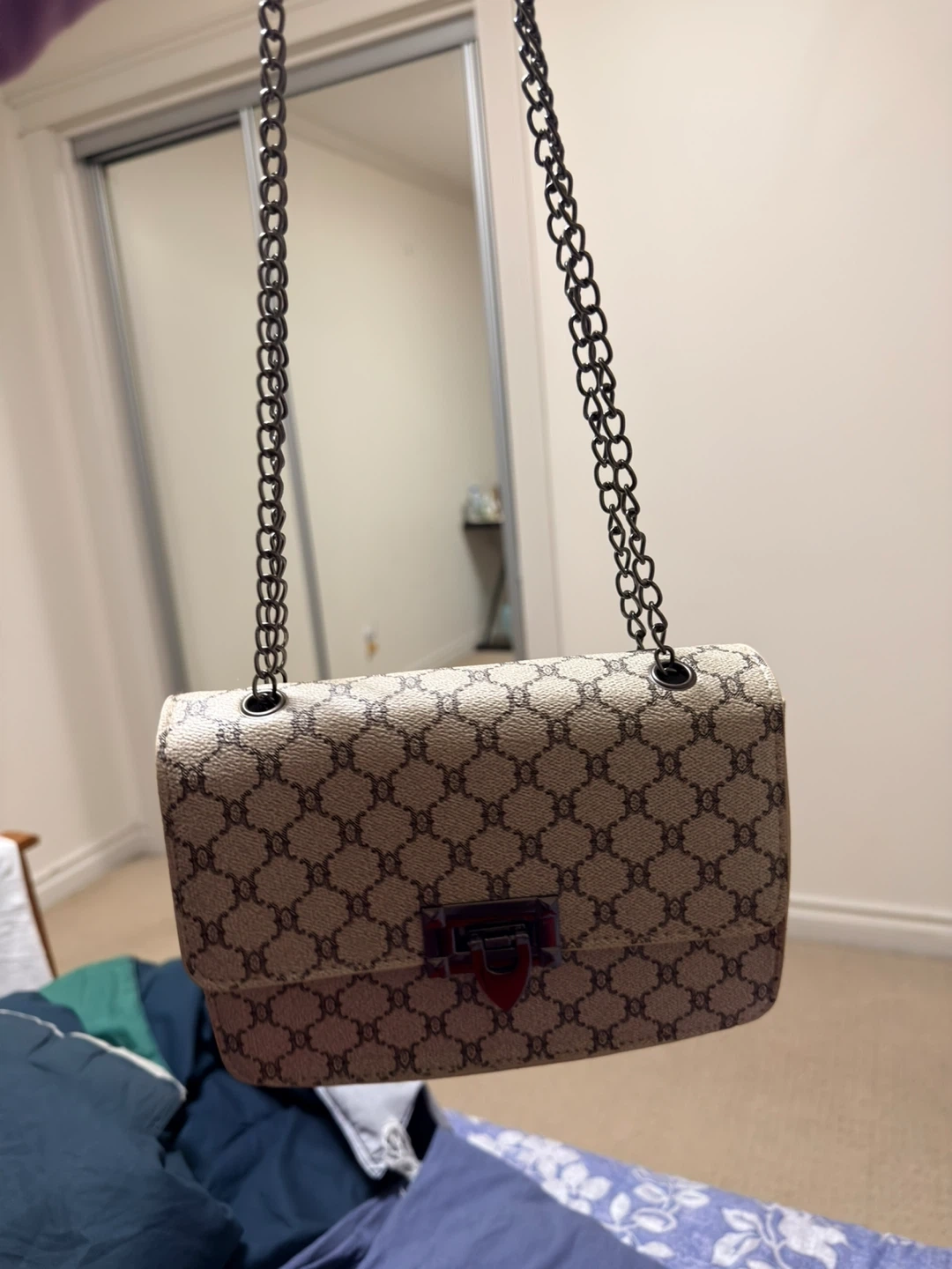 Here's a cute chain shoulder bag! It's in great condition and ready for a new owner. The bag features a unique design with a chain strap, perfect for adding a touch of style to any outfit
