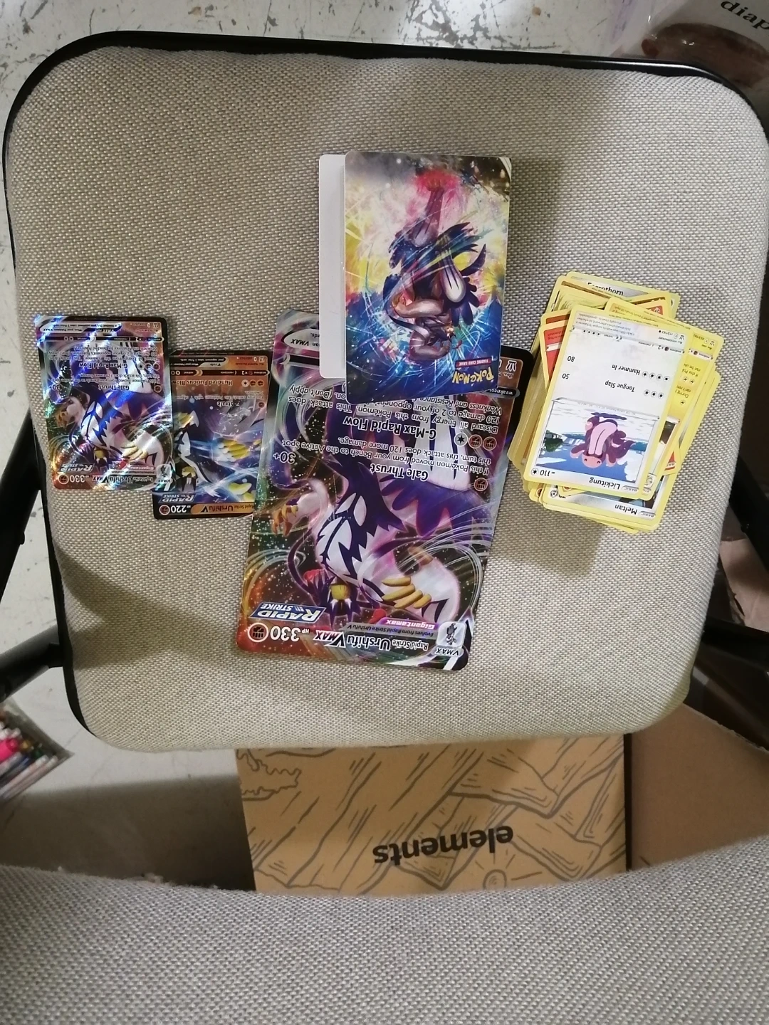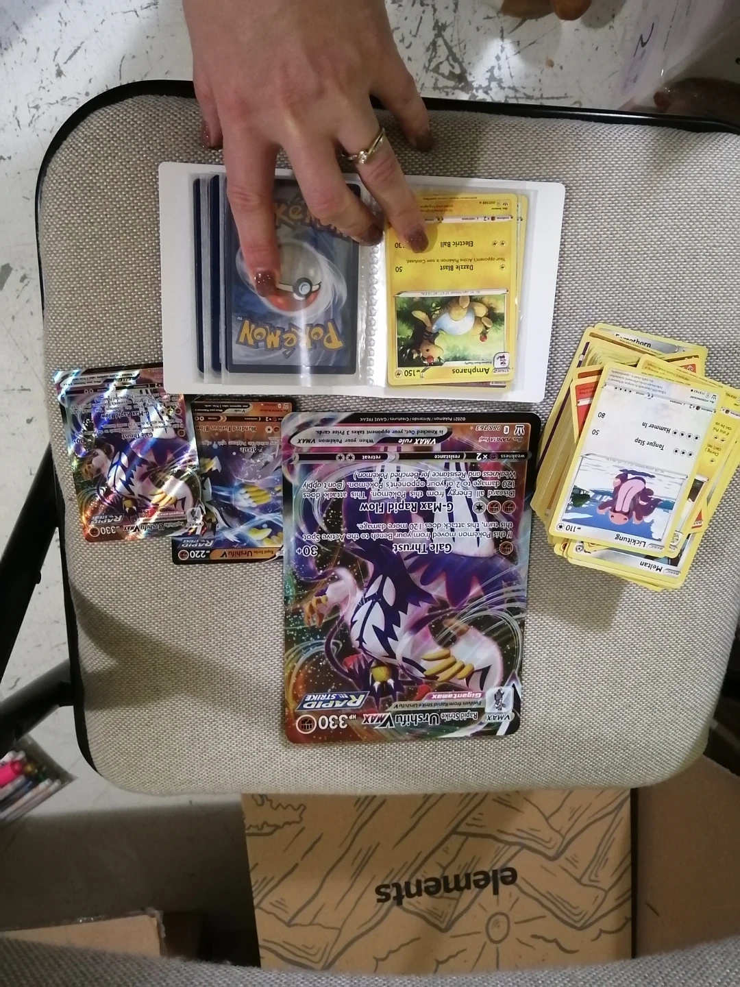 Selling a collection of Pokemon cards, including Urshifu VMAX. They are in great condition and ready for a new collector!