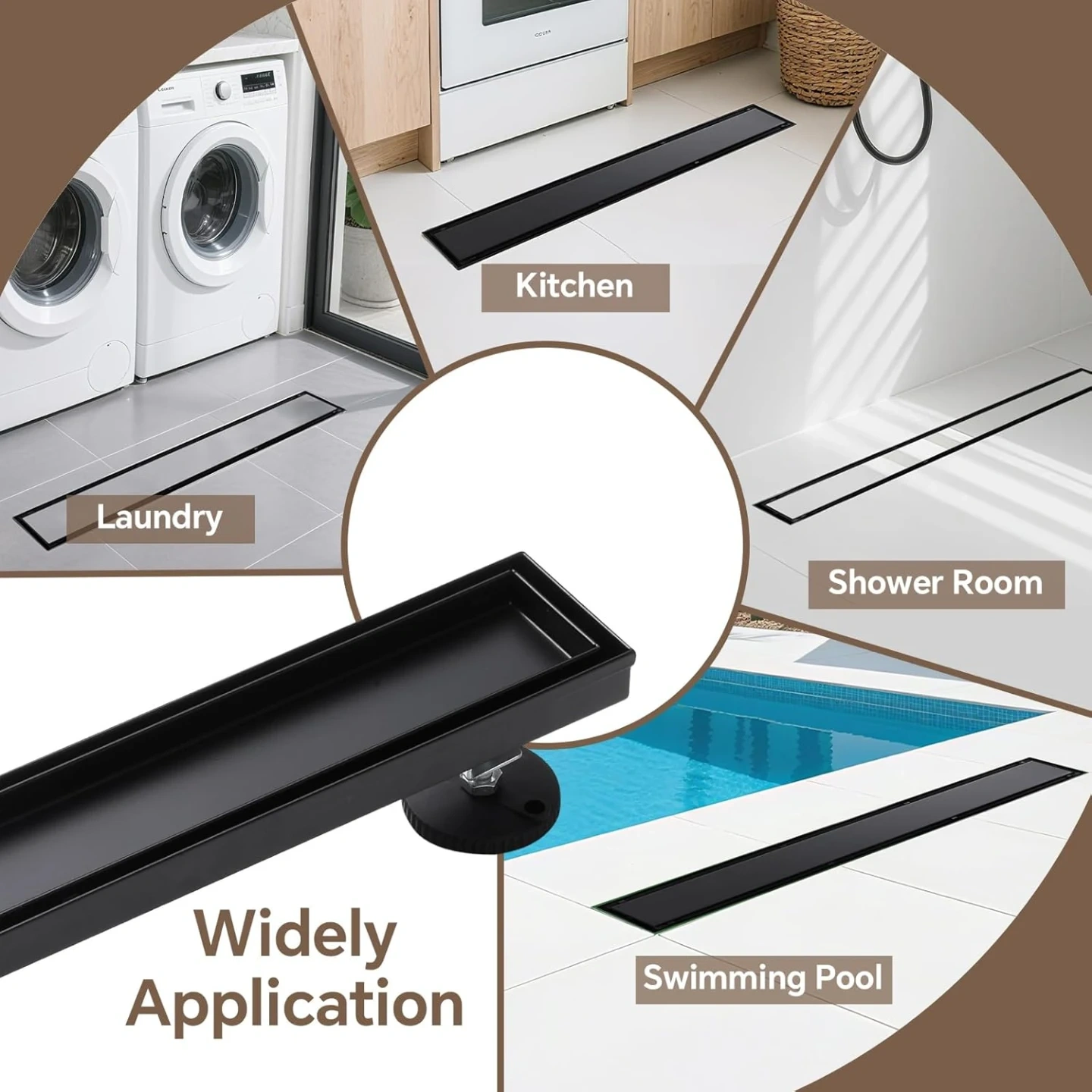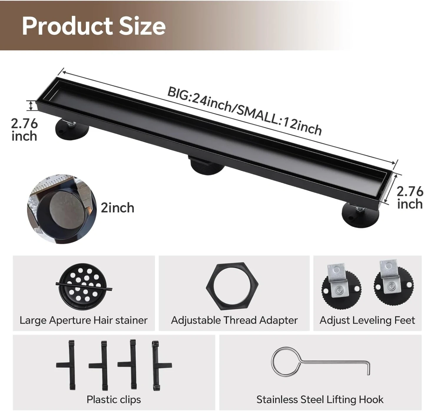 Linear Shower Drain with Tile-in Grate, Material Sus 304, Matt Black, 12 in Rectangle Floor Drain, Shower Floor Drain with Levelling Foot, Hair Strainer, for Bathroom, Balcony (Matt Black, 12 in), Brand New in the Box/Sealed