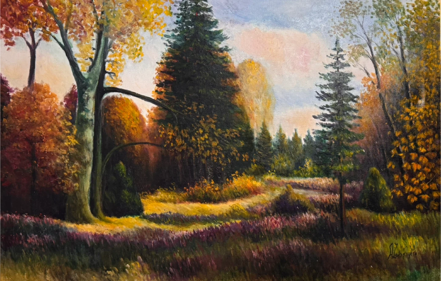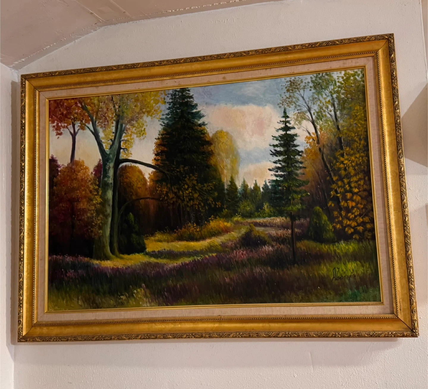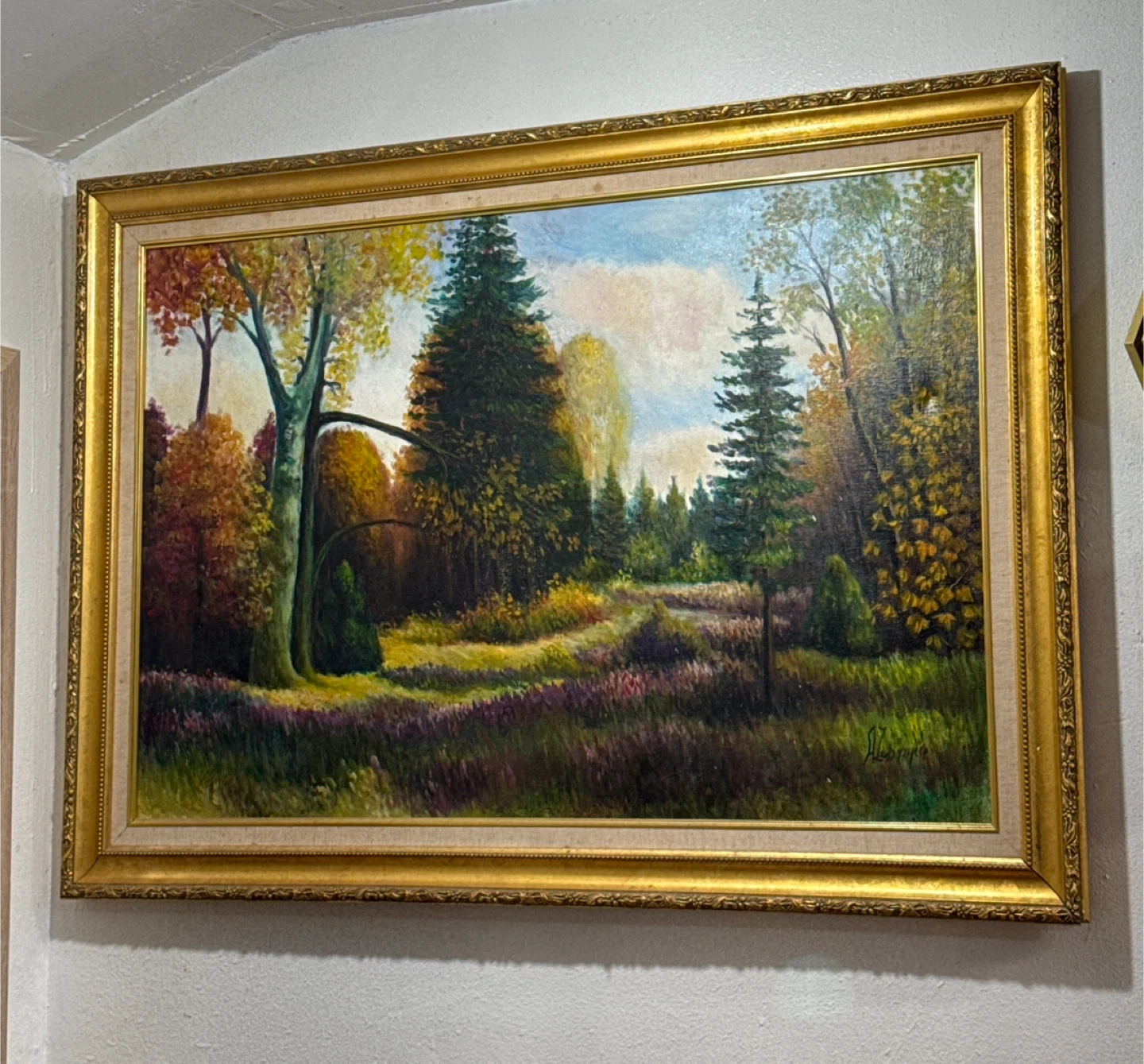 Beautiful hand-painted oil landscape featuring an autumn forest scene with rich colors and visible brush texture. This is an original oil painting on canvas, not a print.