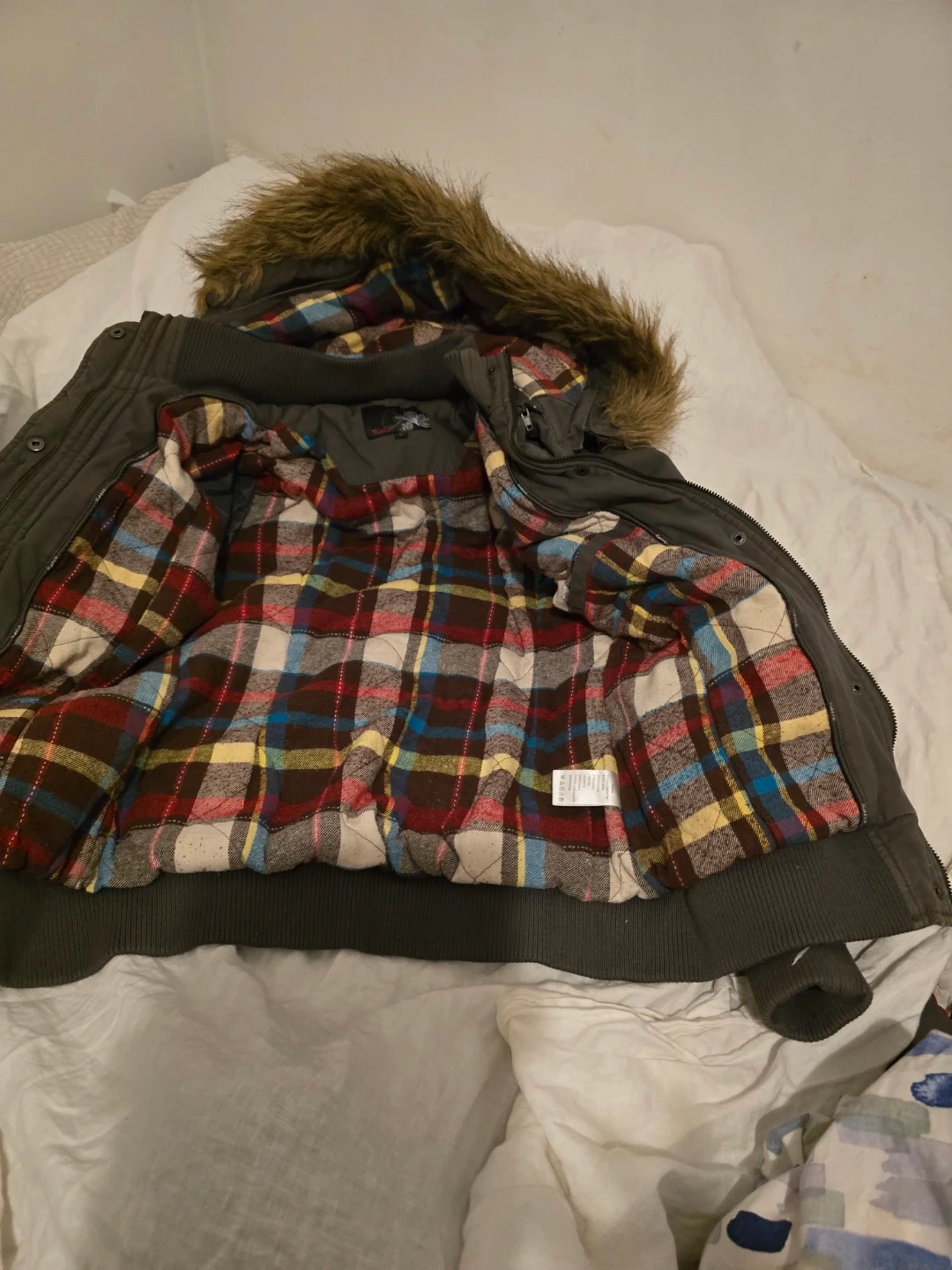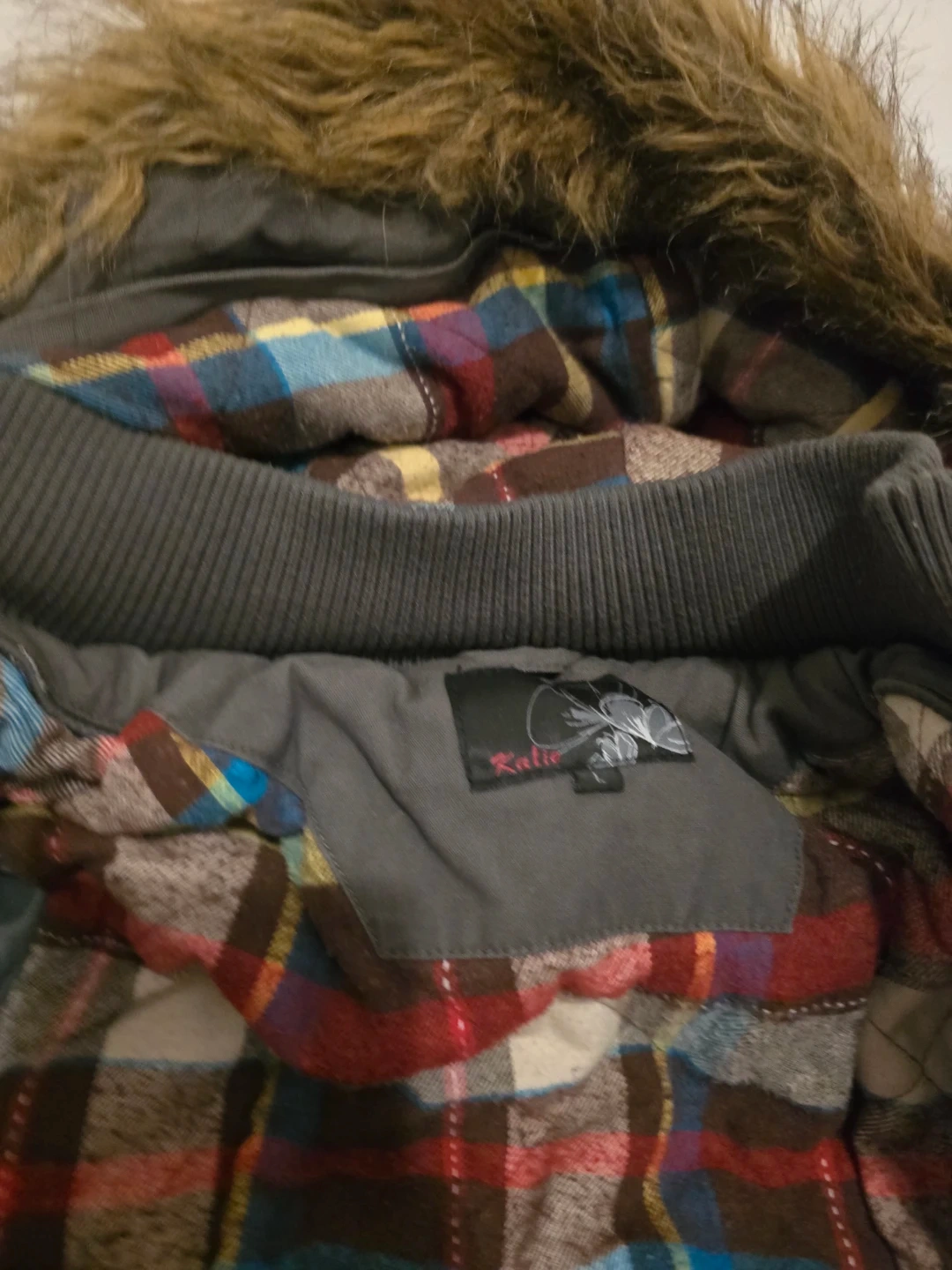 Selling a Katie winter jacket with a fur hood. It's a stylish and warm jacket, perfect for the Canadian winter. The jacket is in good condition and features a plaid lining.