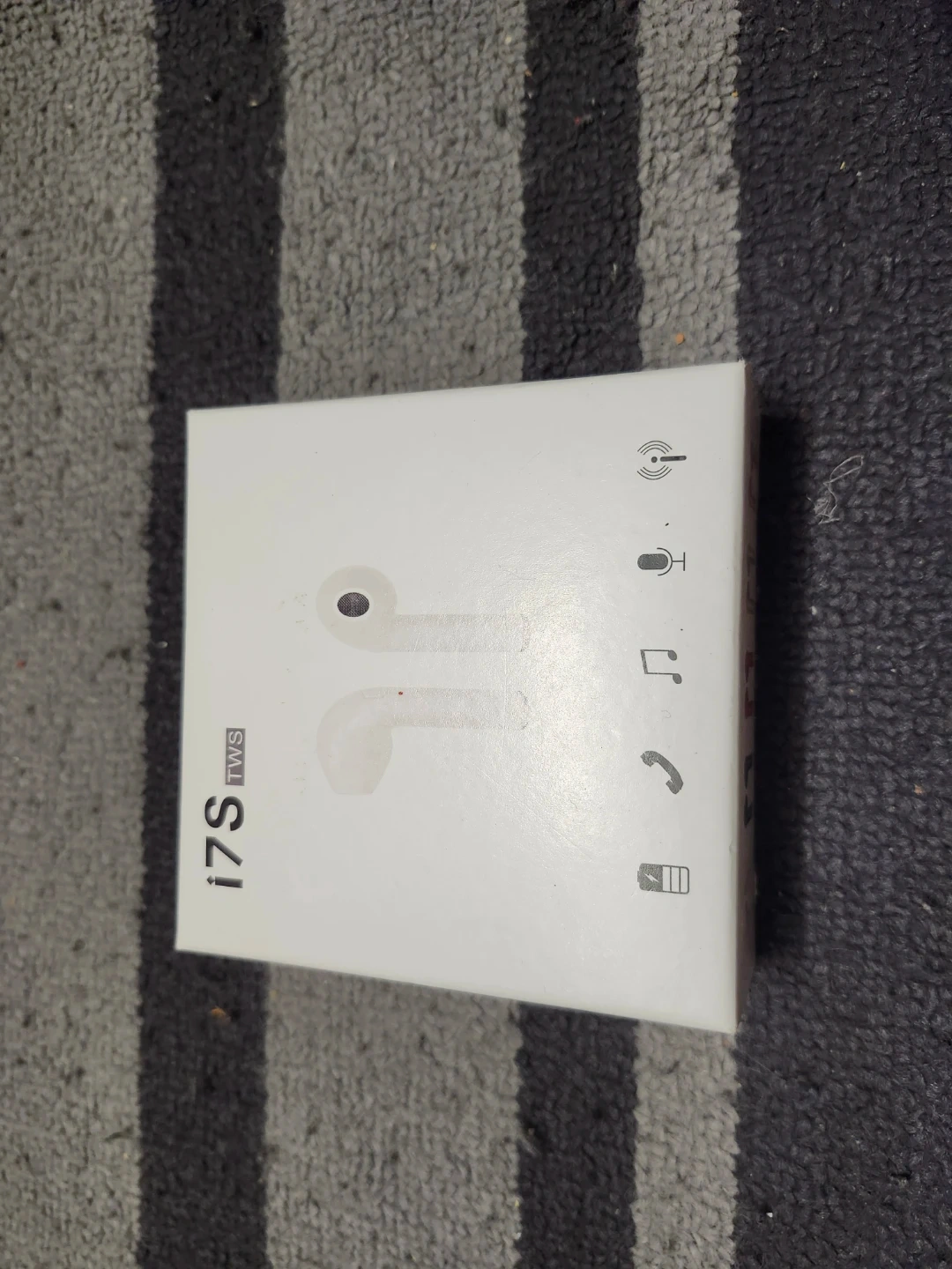 Selling a new pair of i7S TWS wireless earbuds! They come in the original box, ready for a new user. The box includes the charging case and the earbuds themselves. These earbuds are compatible with both iOS and Android devices. They have a working temperature of -10 to 55 degrees Celsius and a standby time of 100 hours