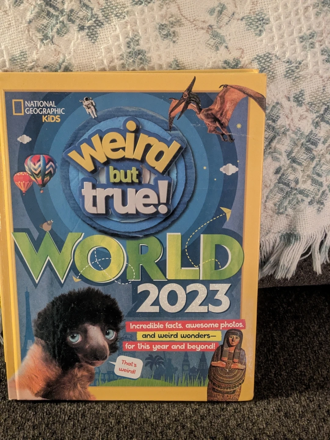 Selling a National Geographic Kids book titled Weird But True! World 2023. It's packed with incredible facts, awesome photos, and weird wonders for this year and beyond! Great for kids who love learning fun and strange things about the world