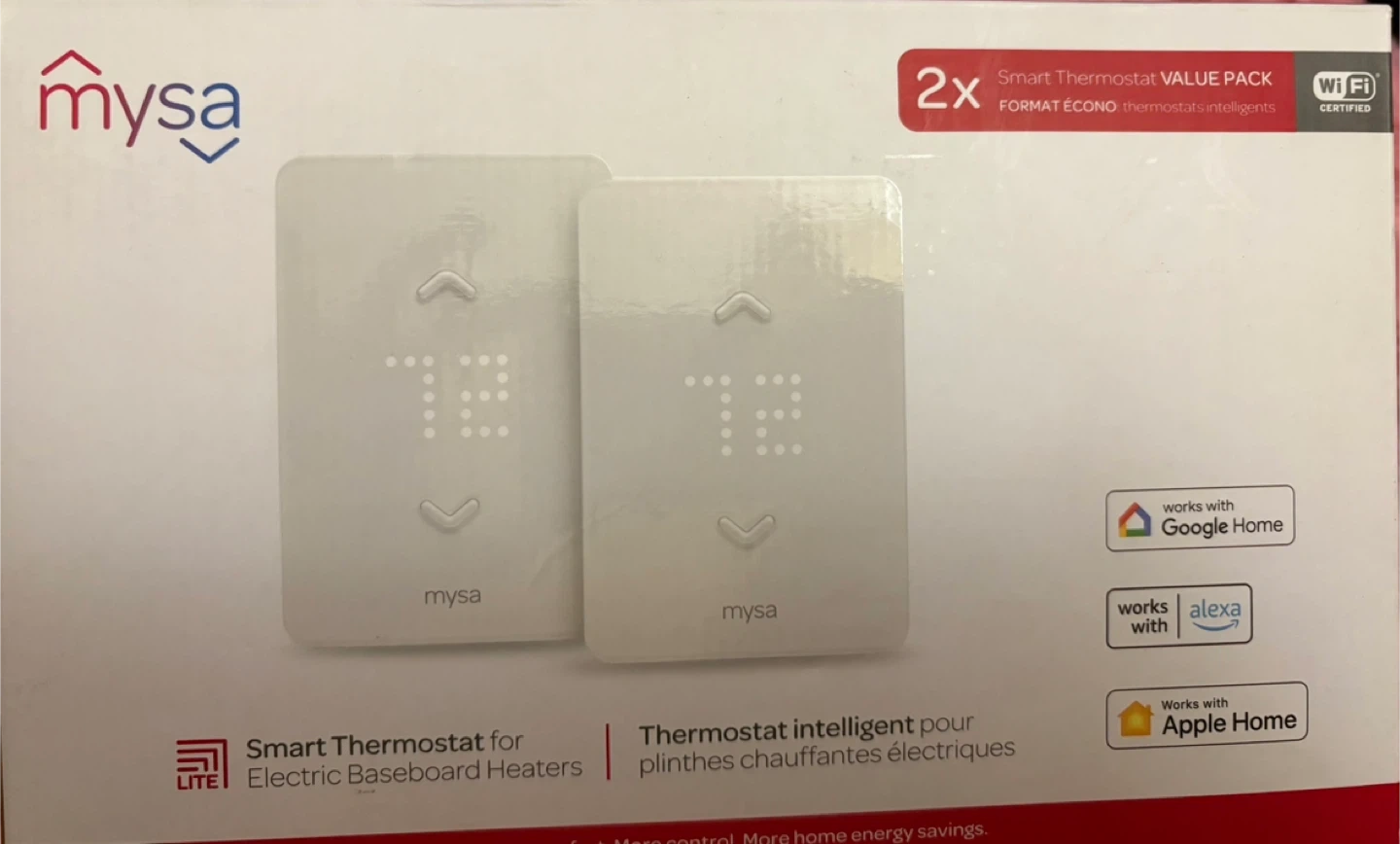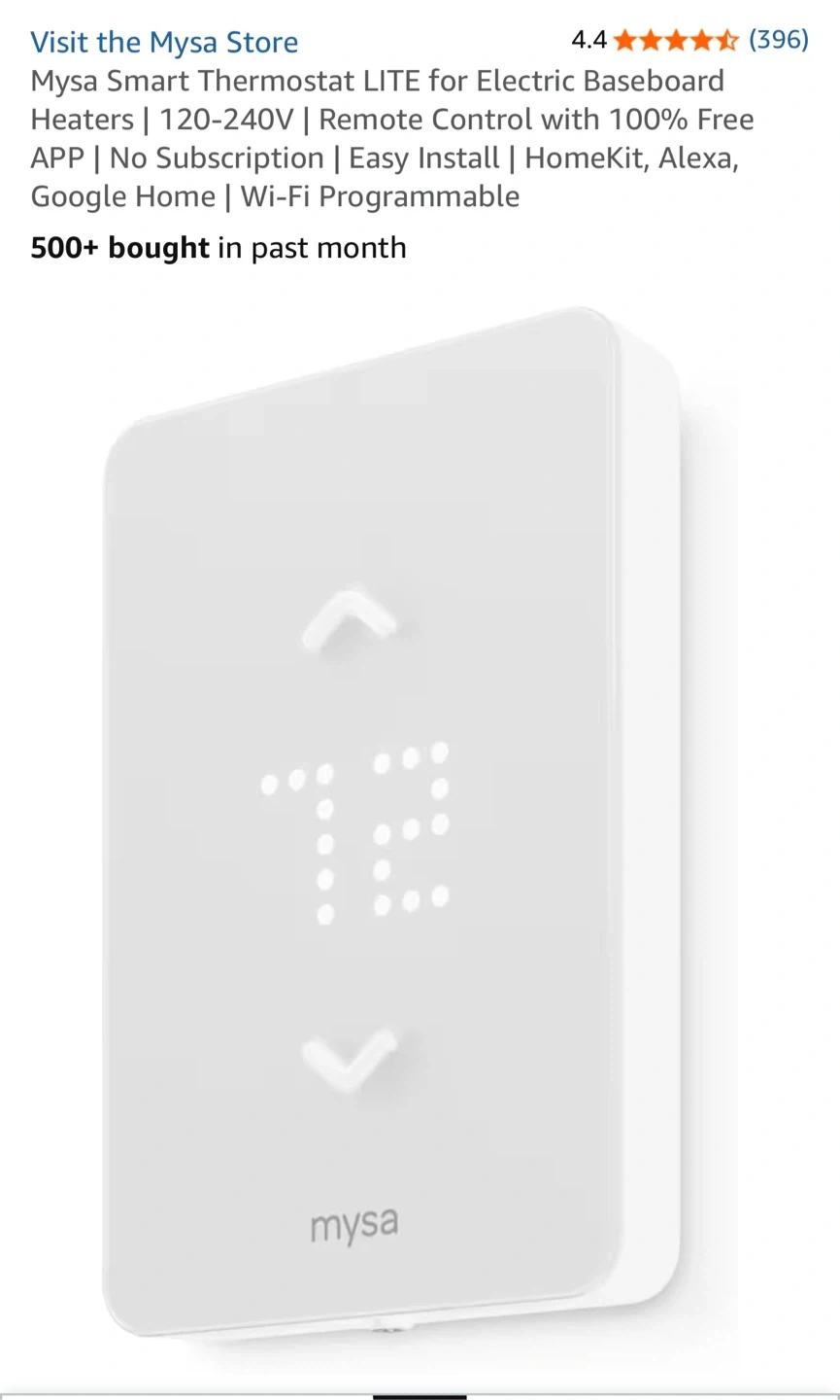 Selling a two pack Mysa Smart Thermostat Lite designed for electric baseboard heaters! It's compatible with 120-240V systems and offers remote control through the Mysa app, which has no subscription fees. It also works seamlessly with HomeKit, Alexa, and Google Home, making it easy to integrate into your smart home setup