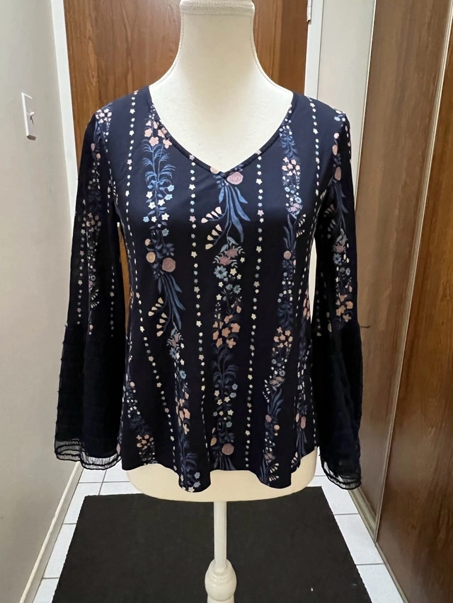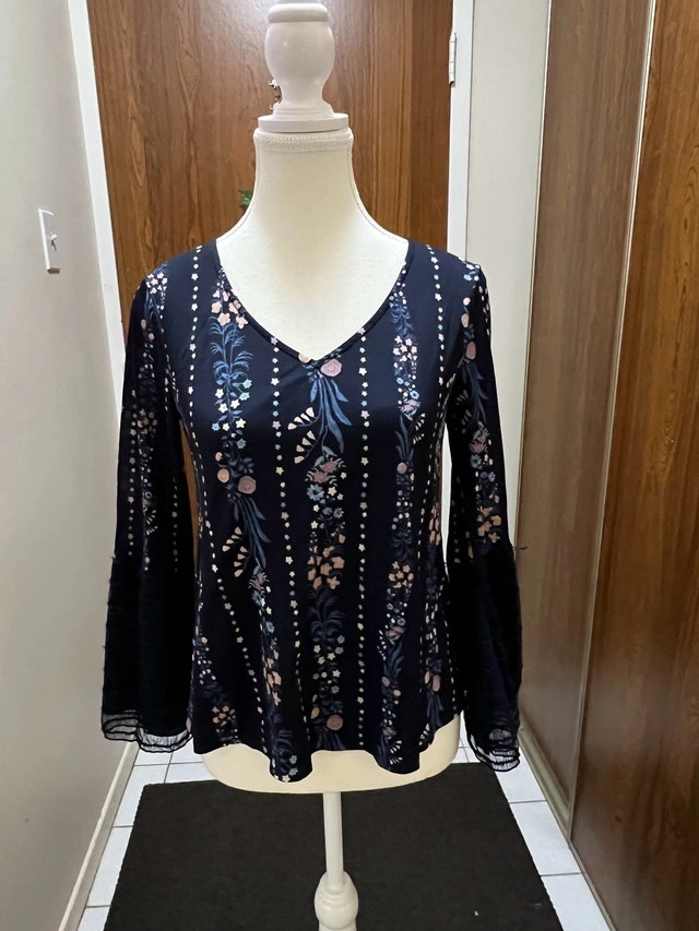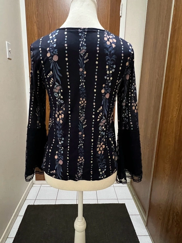 This is a Maurices black floral blouse, size medium, with a v-neck and bell sleeves, perfect for adding a touch of elegance to any outfit. This is a used blouse in good condition.