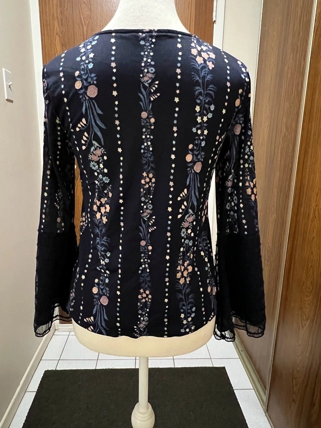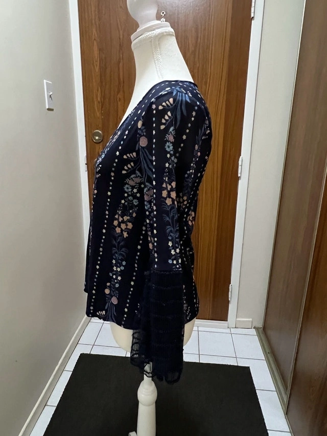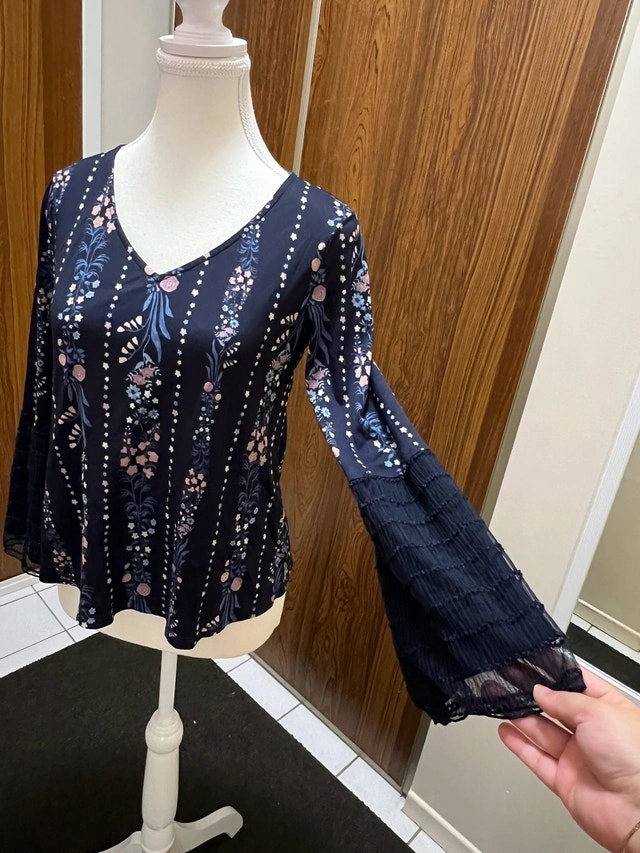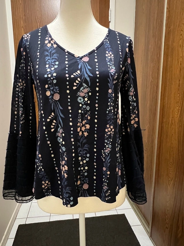 This is a Maurices black floral blouse, size medium, with a v-neck and bell sleeves, perfect for adding a touch of elegance to any outfit. This is a used blouse in good condition.