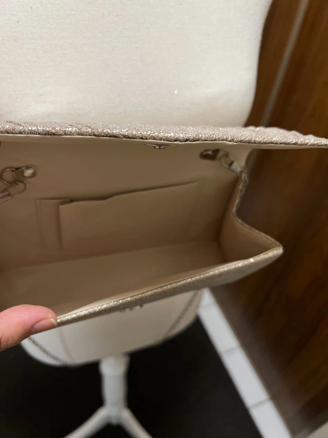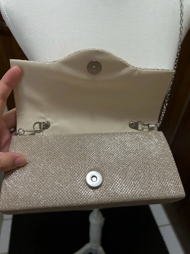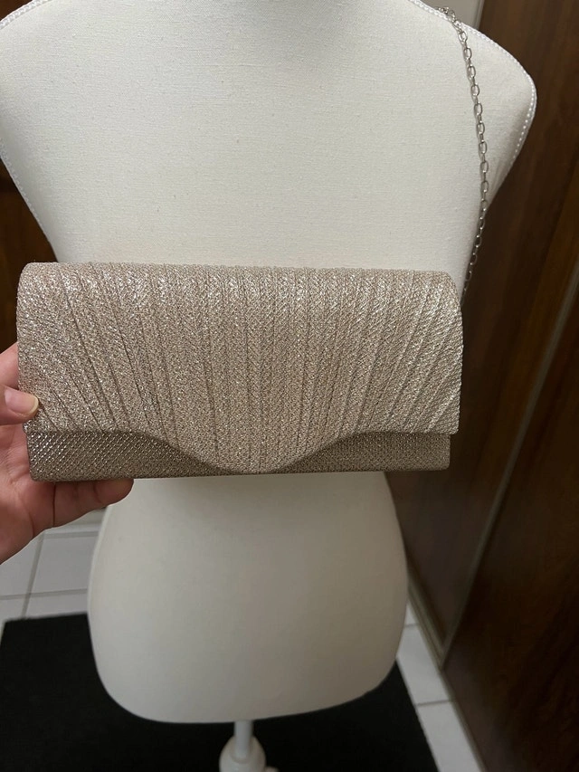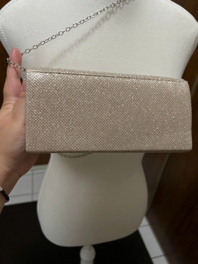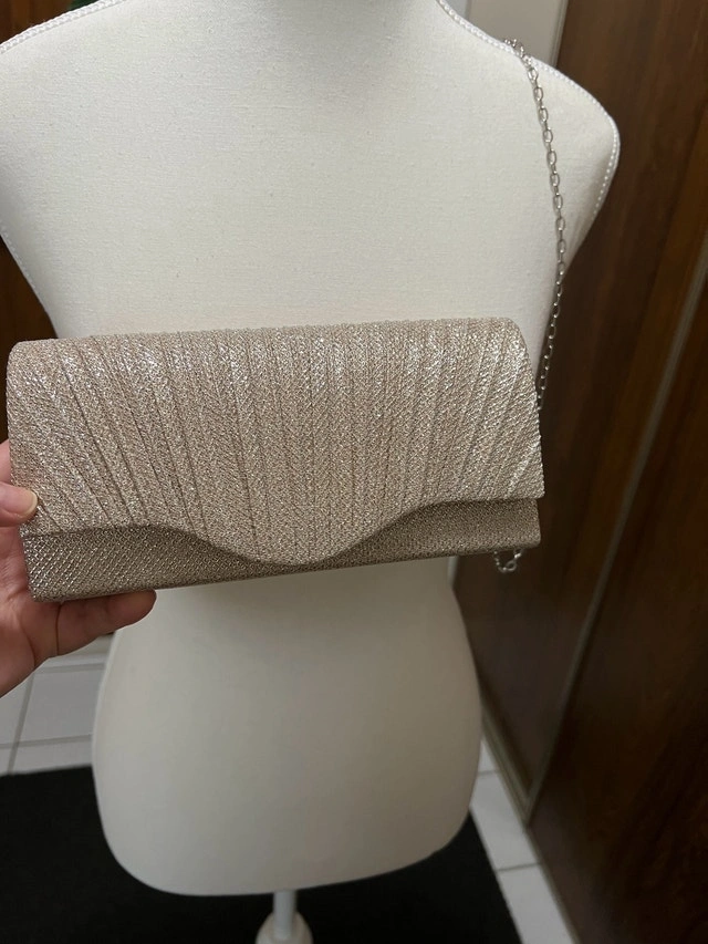 Add a touch of elegance to your evening ensemble with this gold glitter clutch featuring a sleek chain strap. This eye-catching accessory is new and not used. Ready to elevate your style for any special occasion or night out. If the ad is up, it's available; let's find this beauty a new home! ✨