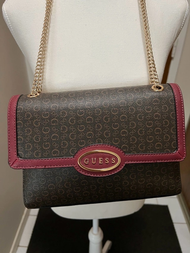 This Guess handbag features a stylish monogram pattern with a maroon trim, perfect for adding a touch of sophistication to any outfit. It's in good, used condition. The strap is gold.