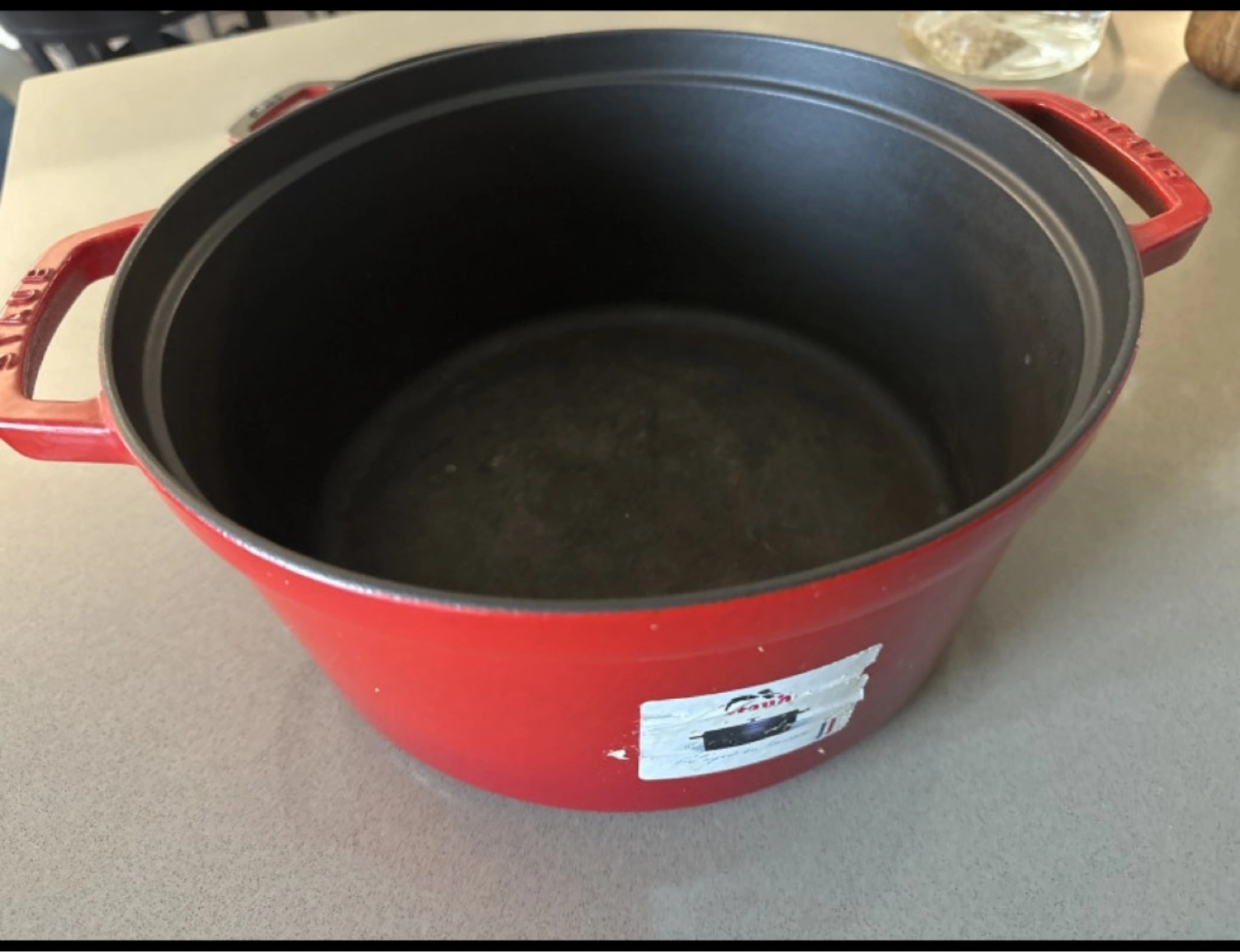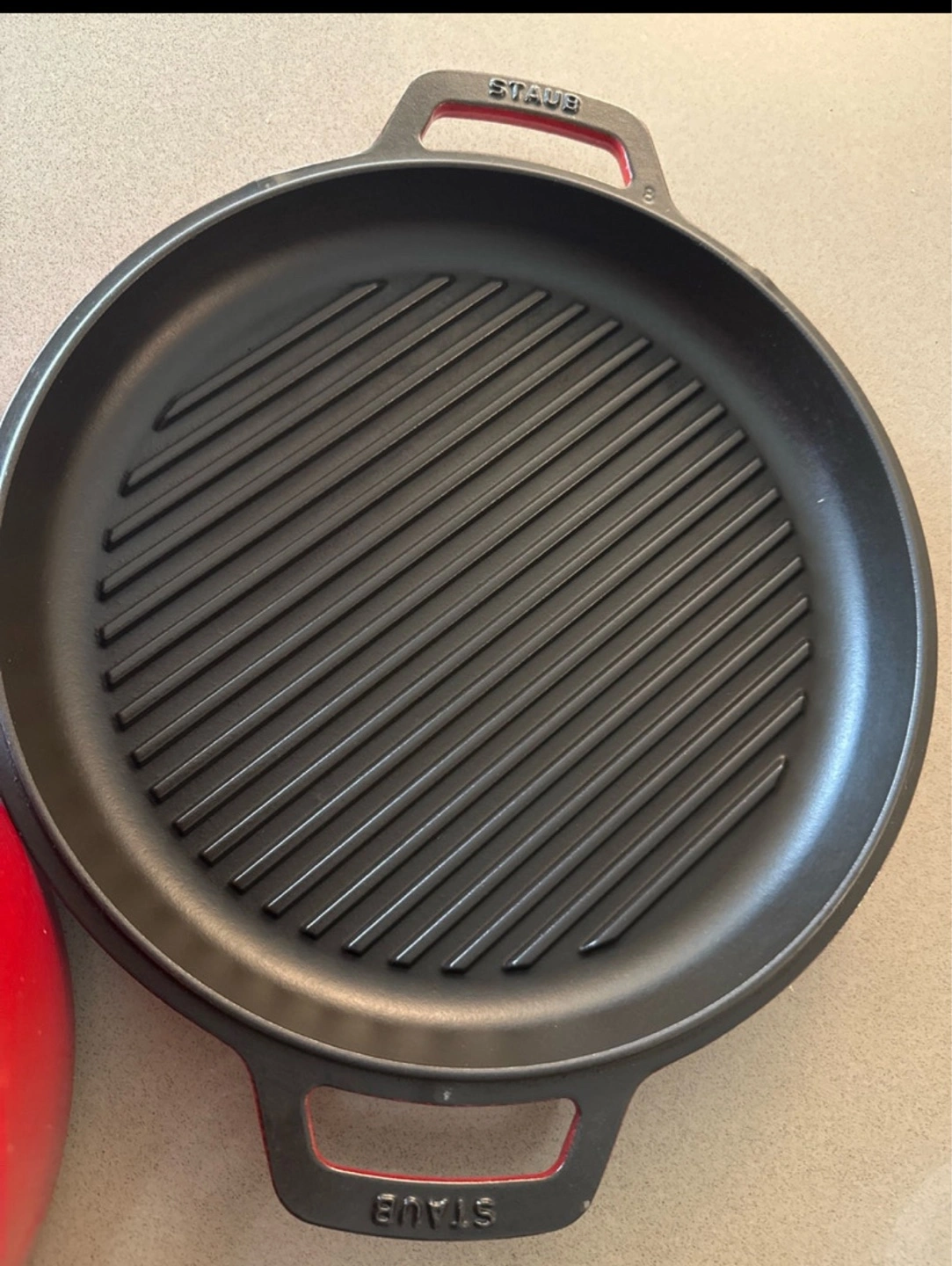 Selling a Staub Dutch oven with a grill lid. It's in good condition and ready for your next culinary adventure! This set is perfect for slow cooking, braising, roasting, and grilling. The Dutch oven is a vibrant red colour and is made in France.