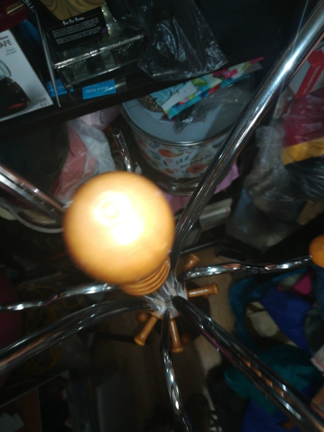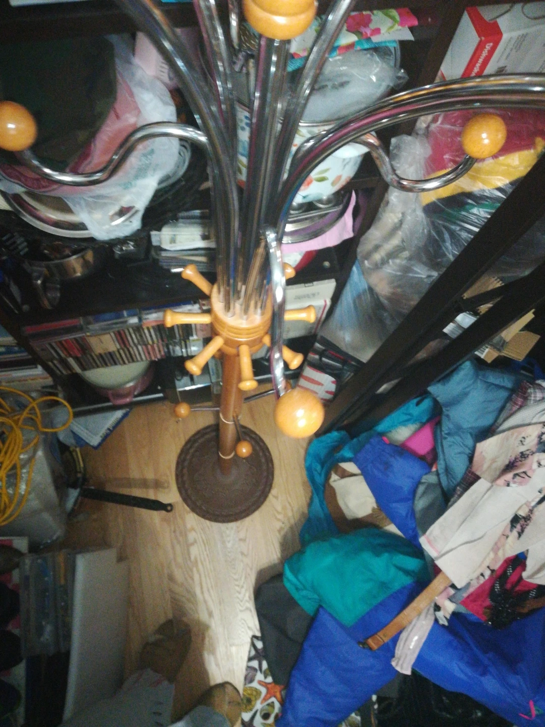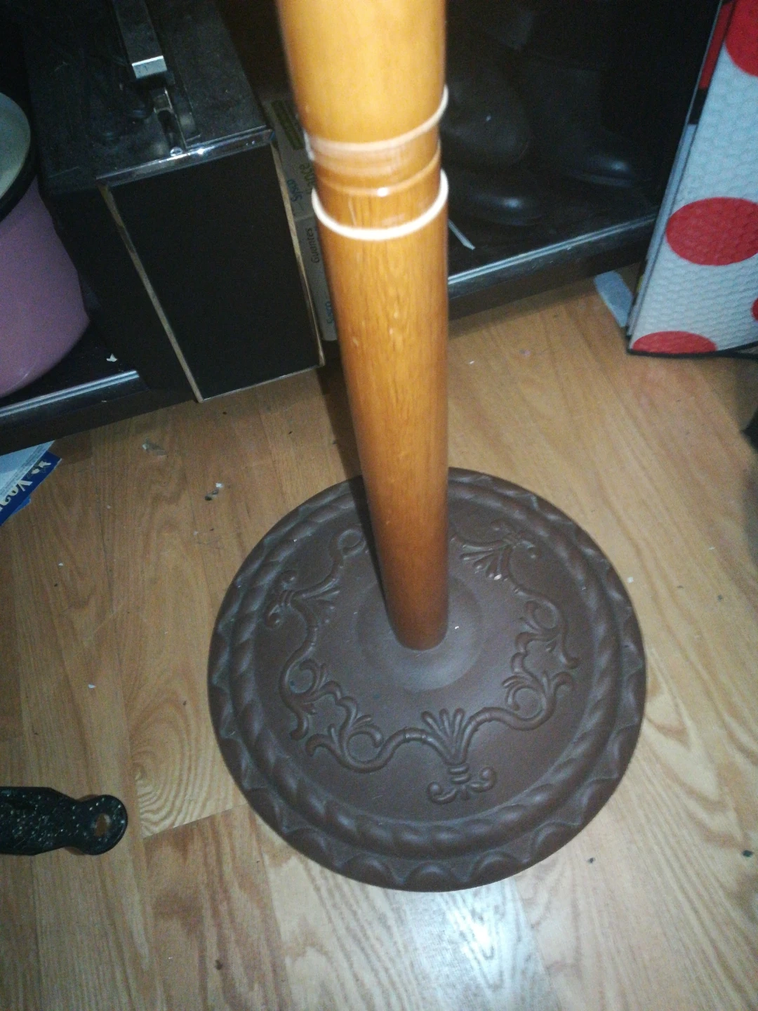 Selling a standing coat rack with a wood and metal design. It's in good condition and ready to hold your coats, hats, and bags! Features a sturdy base and multiple hooks for ample storage