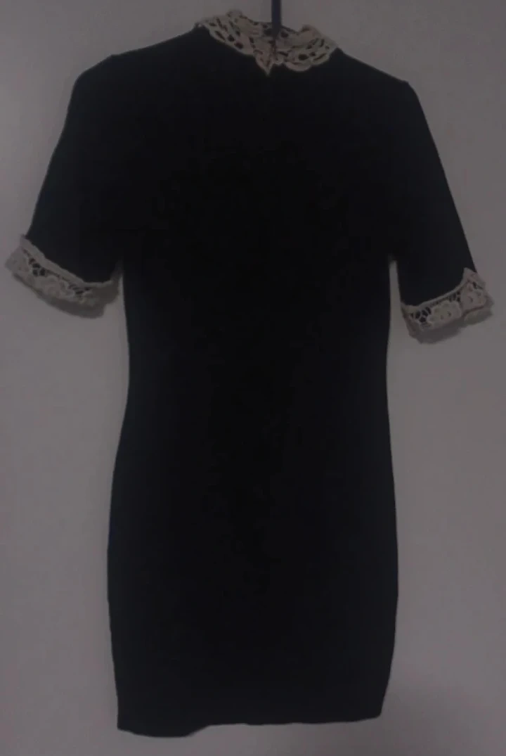 Cute black mini dress with a unique lace collar and sleeve detail! It's perfect for a night out or a special occasion (also passes as a Wednesday Costume!)