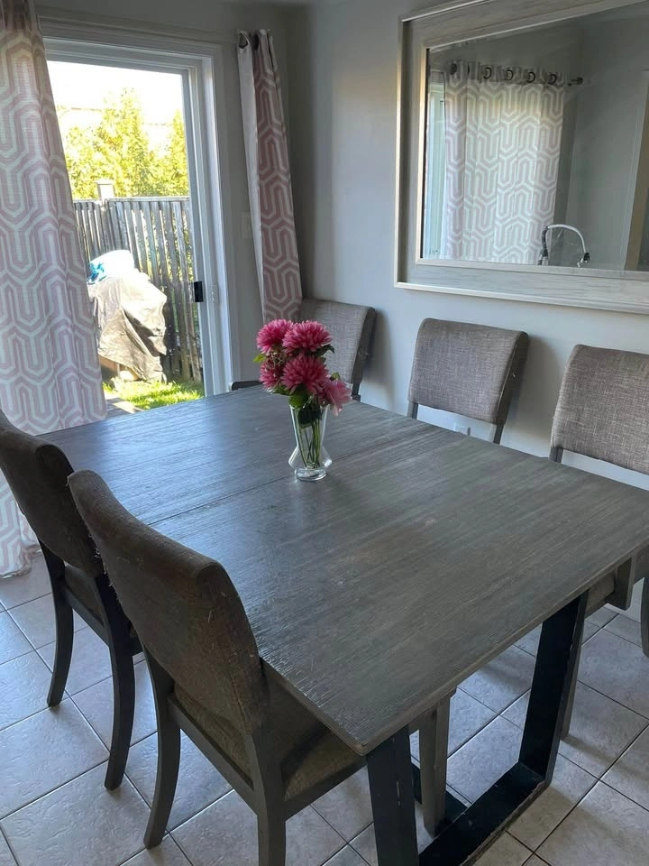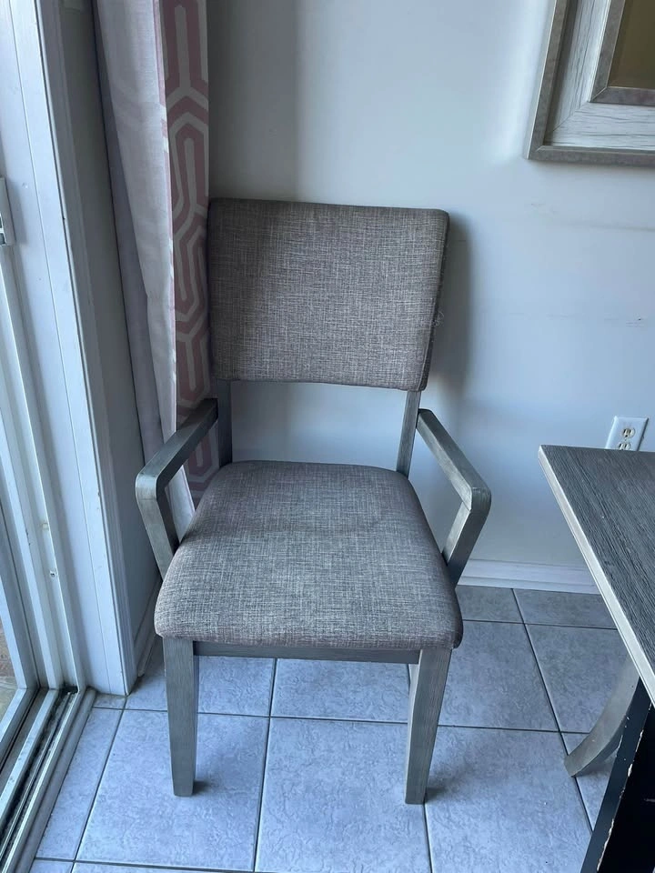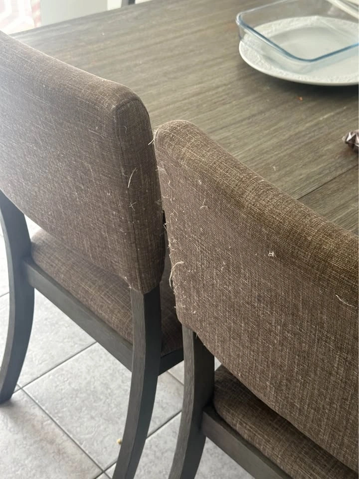Used with wear and tear. Table and legs have scratches and chips and the chairs need a deep shampoo cleaning. This can all be completely restored and the table and chairs are all functionally very sturdy.