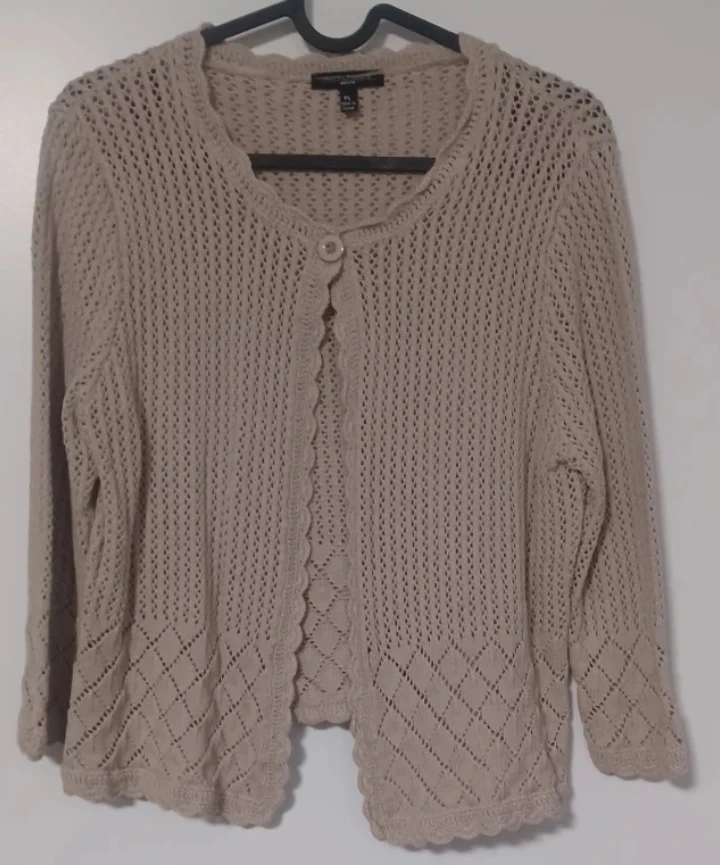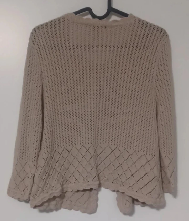 Cozy Notations Petite cardigan in size PL. It's a lovely neutral colour and perfect for layering. The open knit design makes it breathable and stylish. Great for adding a touch of warmth and texture to any outfit!