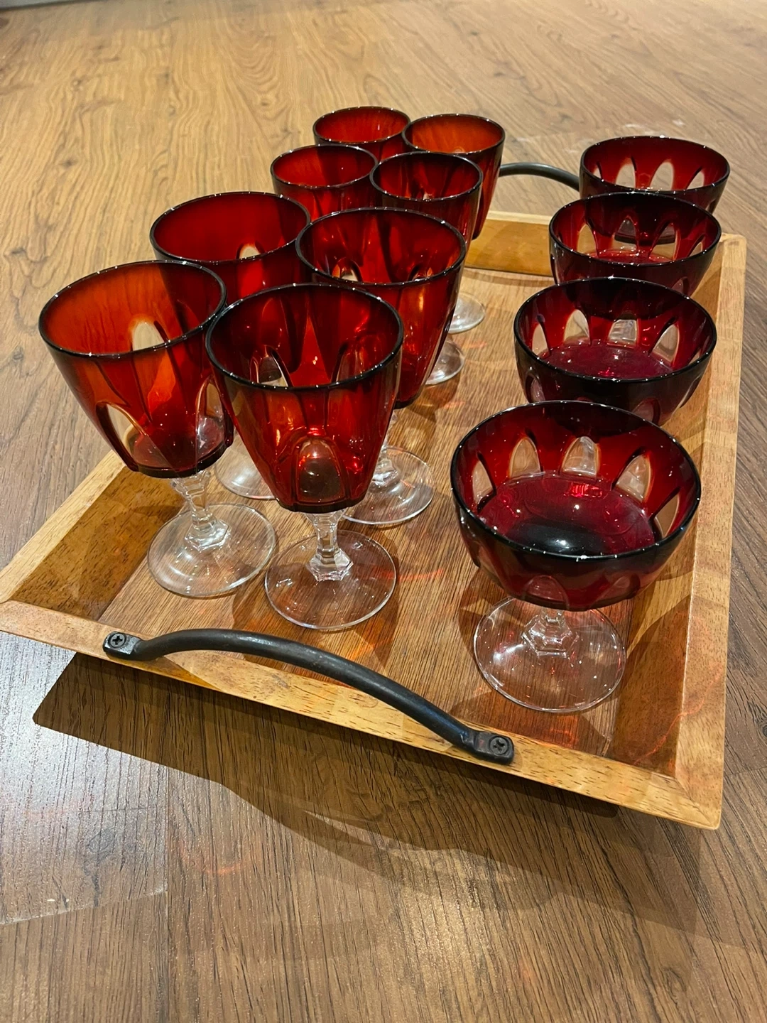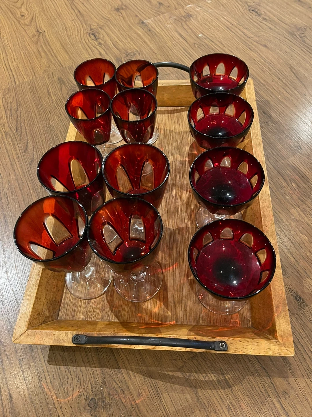 Selling a beautiful set of vintage ruby red glassware! The set includes a mix of 12 stemmed glasses (4 wine, 4 dessert,4 sherry), perfect for adding a touch of elegance to any occasion. They're in excellent condition!