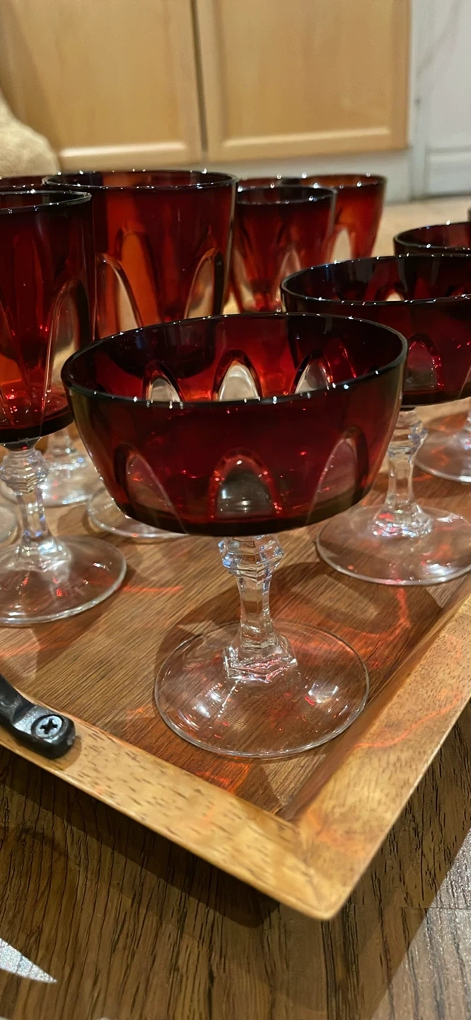 Selling a beautiful set of vintage ruby red glassware! The set includes a mix of 12 stemmed glasses (4 wine, 4 dessert,4 sherry), perfect for adding a touch of elegance to any occasion. They're in excellent condition!
