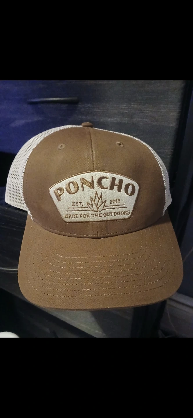FREE!! Poncho brand trucker-style hat! It's a brown color with a white mesh back. The patch says 'Poncho Est. 2018 Made for the Outdoors, Pick up only at location below only