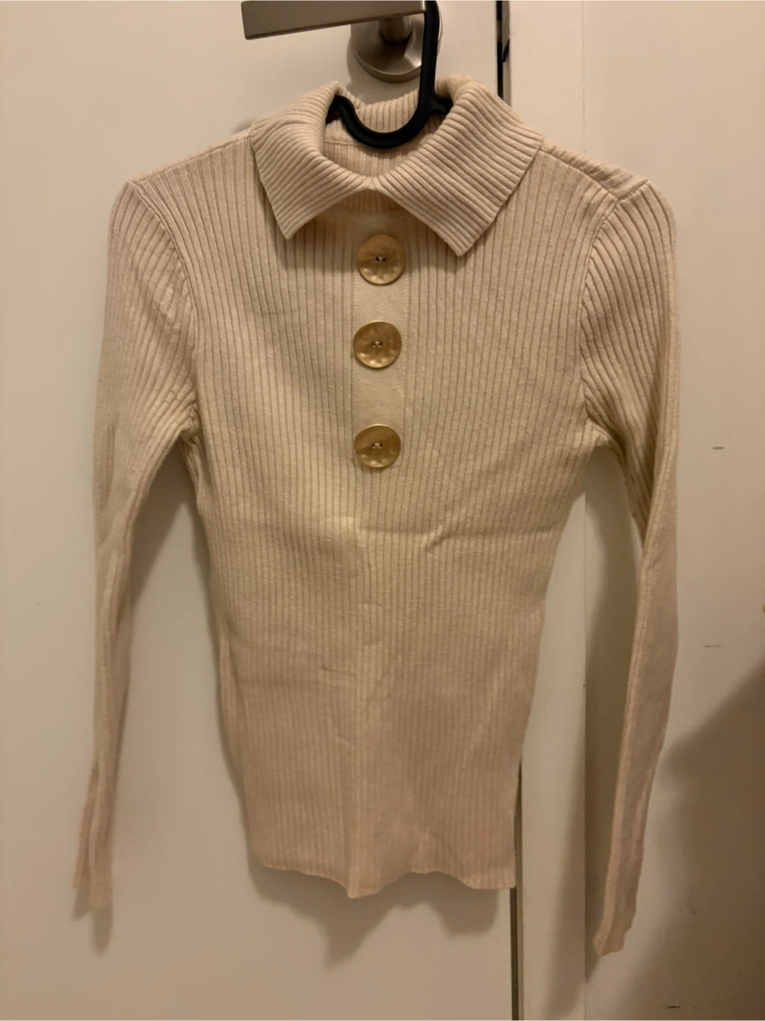 A cute and comfy beige ribbed knit top with a collared neckline and button-down front. It's perfect for layering or wearing on its own. The material is soft and stretchy, making it a comfortable fit. It's in great condition and ready for a new home!