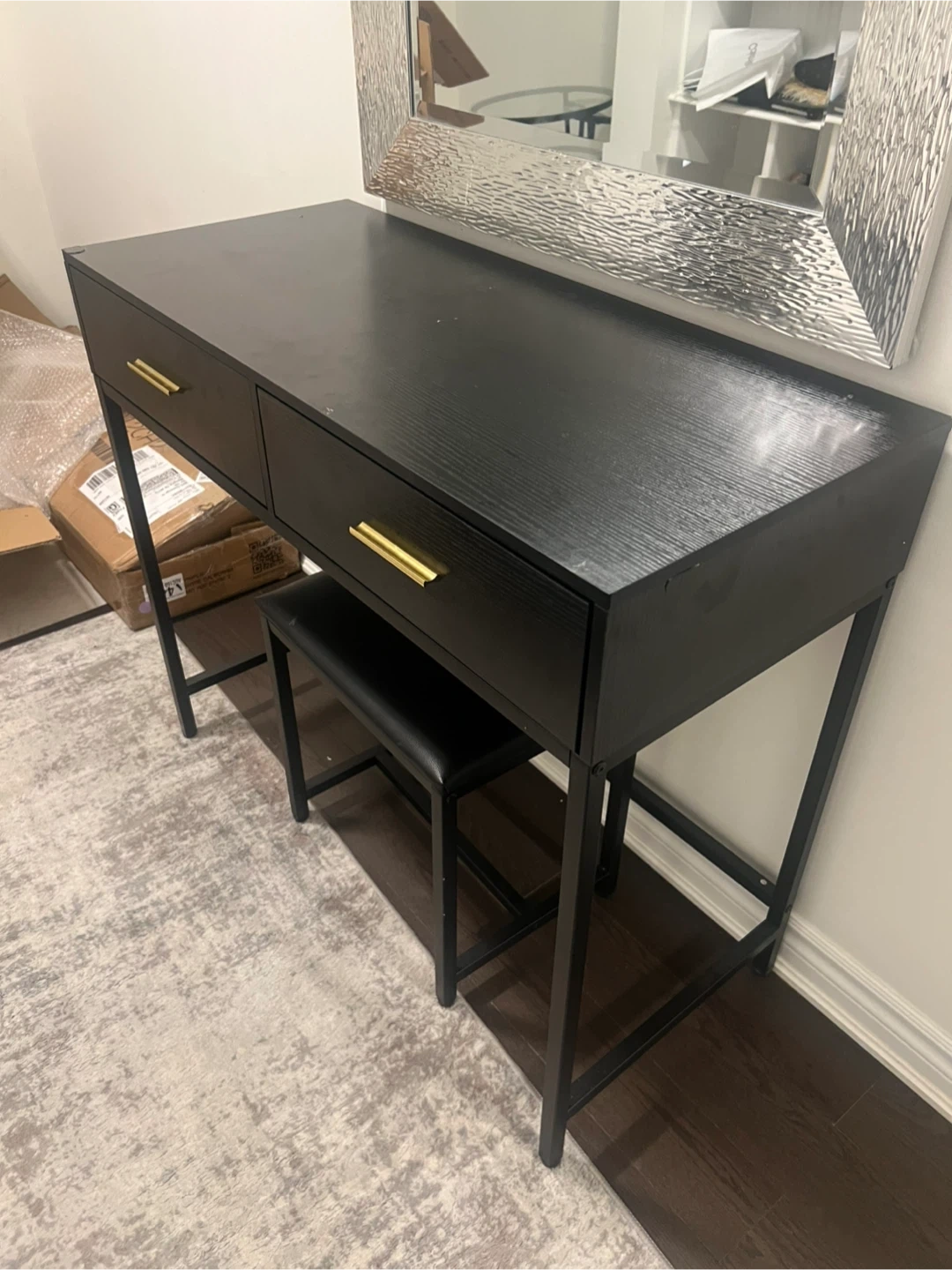 Selling a sleek black vanity desk with a matching stool! The desk features two drawers with gold-tone handles. Dimensions are approximately 90cm (35.4in) wide, 78cm (30.7in) tall, and 40cm (15.7in) deep. Perfect for a bedroom or small space!