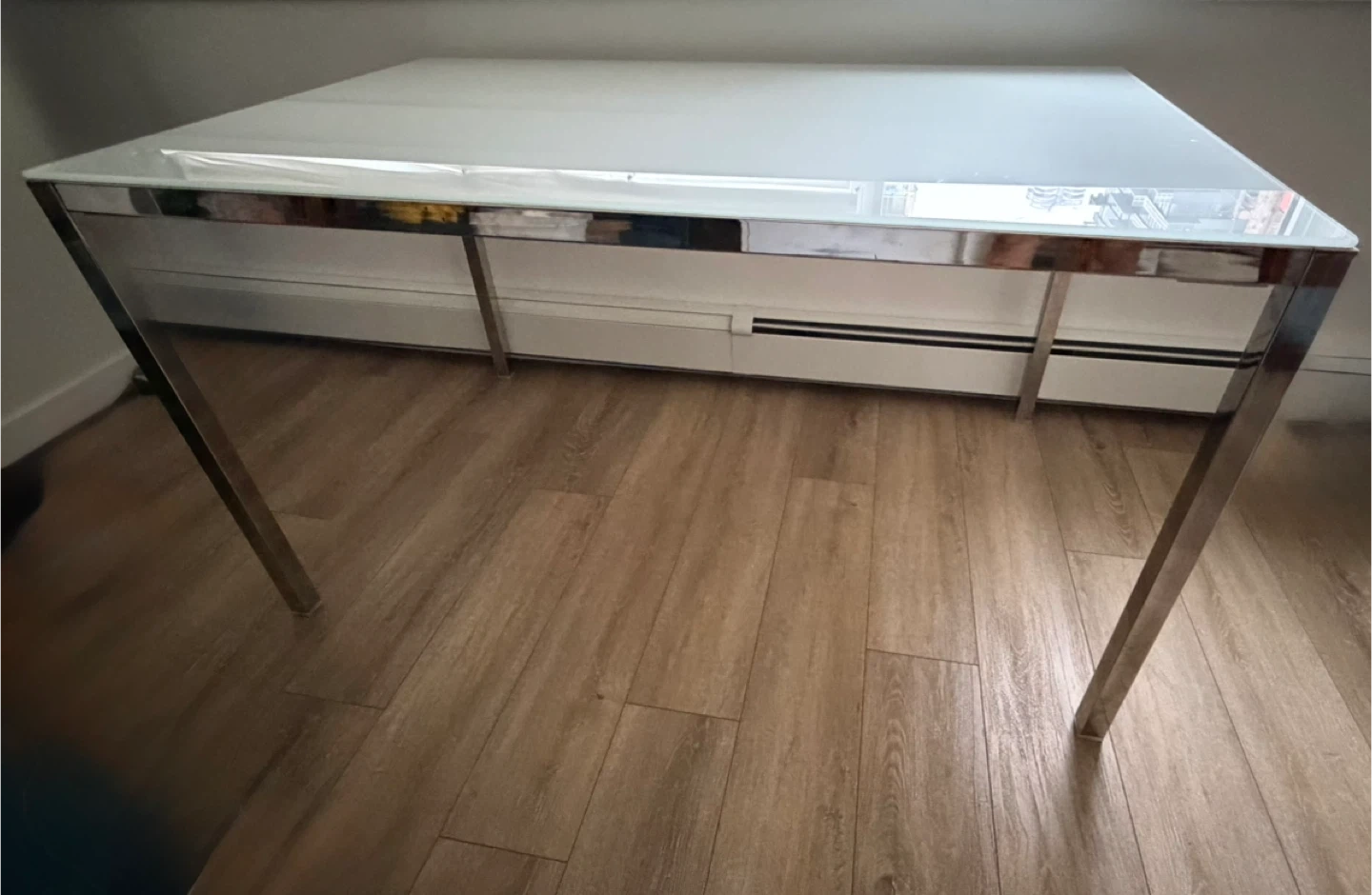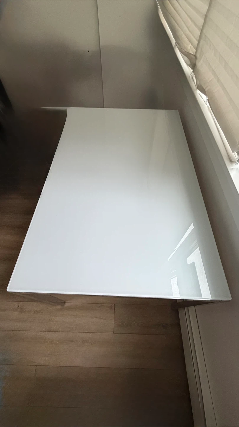 Selling a modern dining table with a white glass top and a chrome frame. The table is in great condition and would look great in any dining room or kitchen!