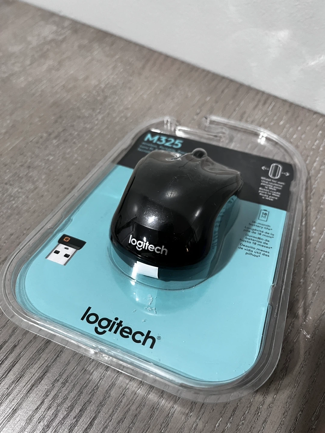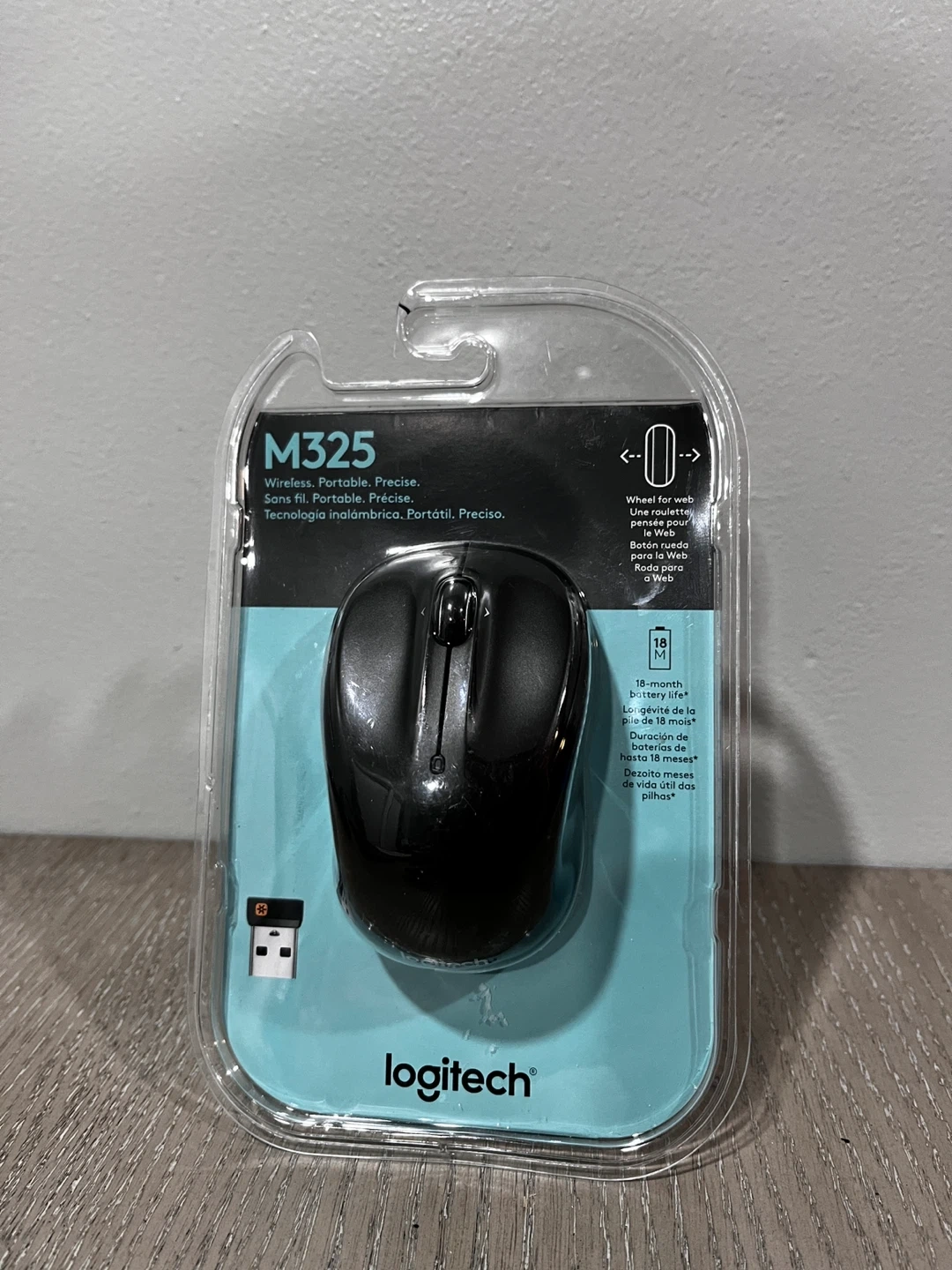 Selling a brand new Logitech M325 wireless mouse in black! It's still in its original packaging. This mouse is wireless, portable, and precise. It also has a wheel for web navigation.