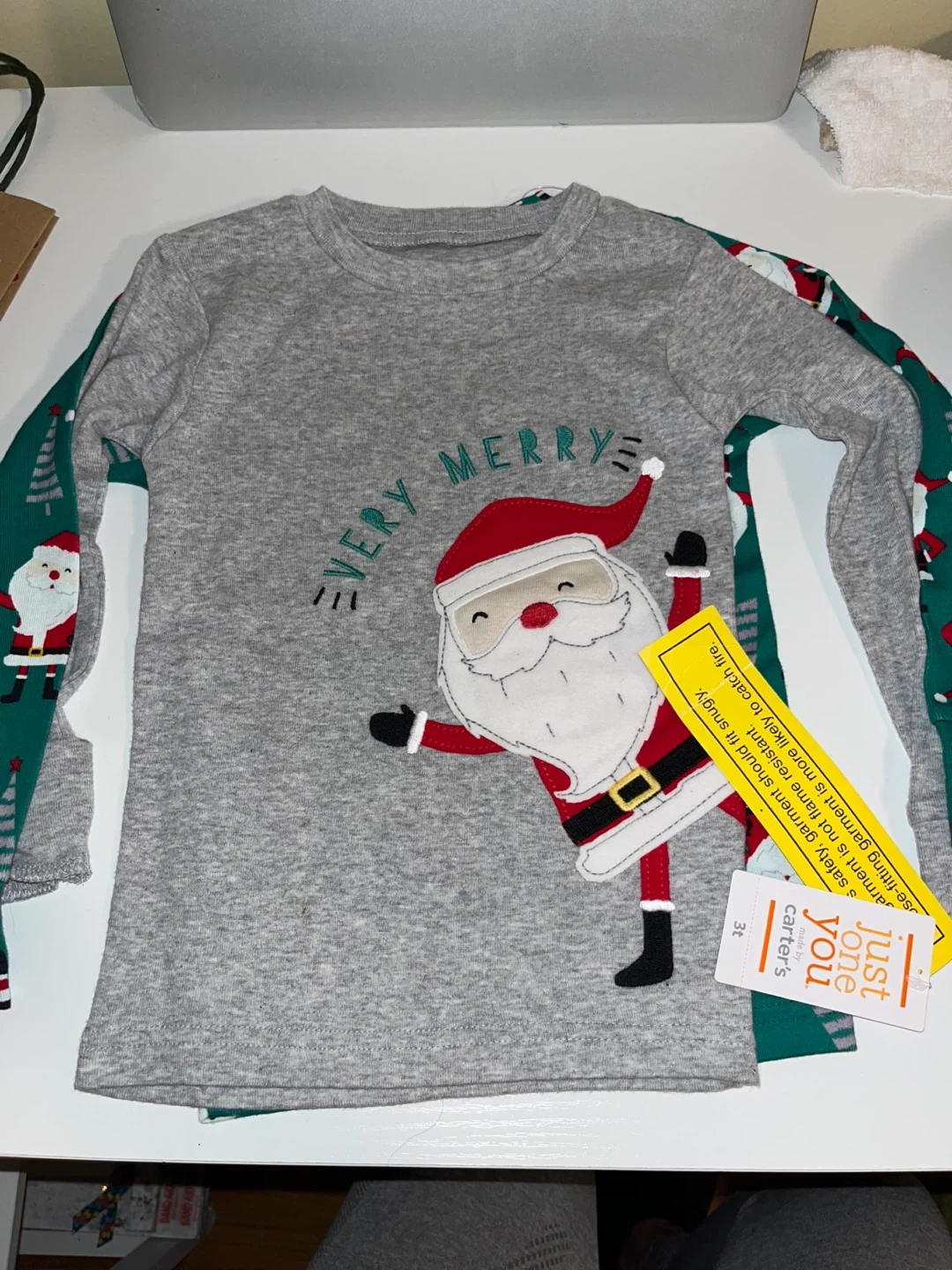 This is a brand new with tags Carter's Christmas pajama set in size 3T! It features a cute Santa design on a gray long-sleeve shirt and green printed pants. Perfect for the holiday season!
