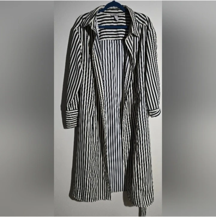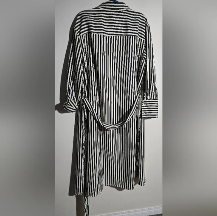 Here's a stylish striped shirt dress from H&M! It's a size large and features a classic black and white stripe pattern. Perfect for a casual or dressed-up look, and super comfy too