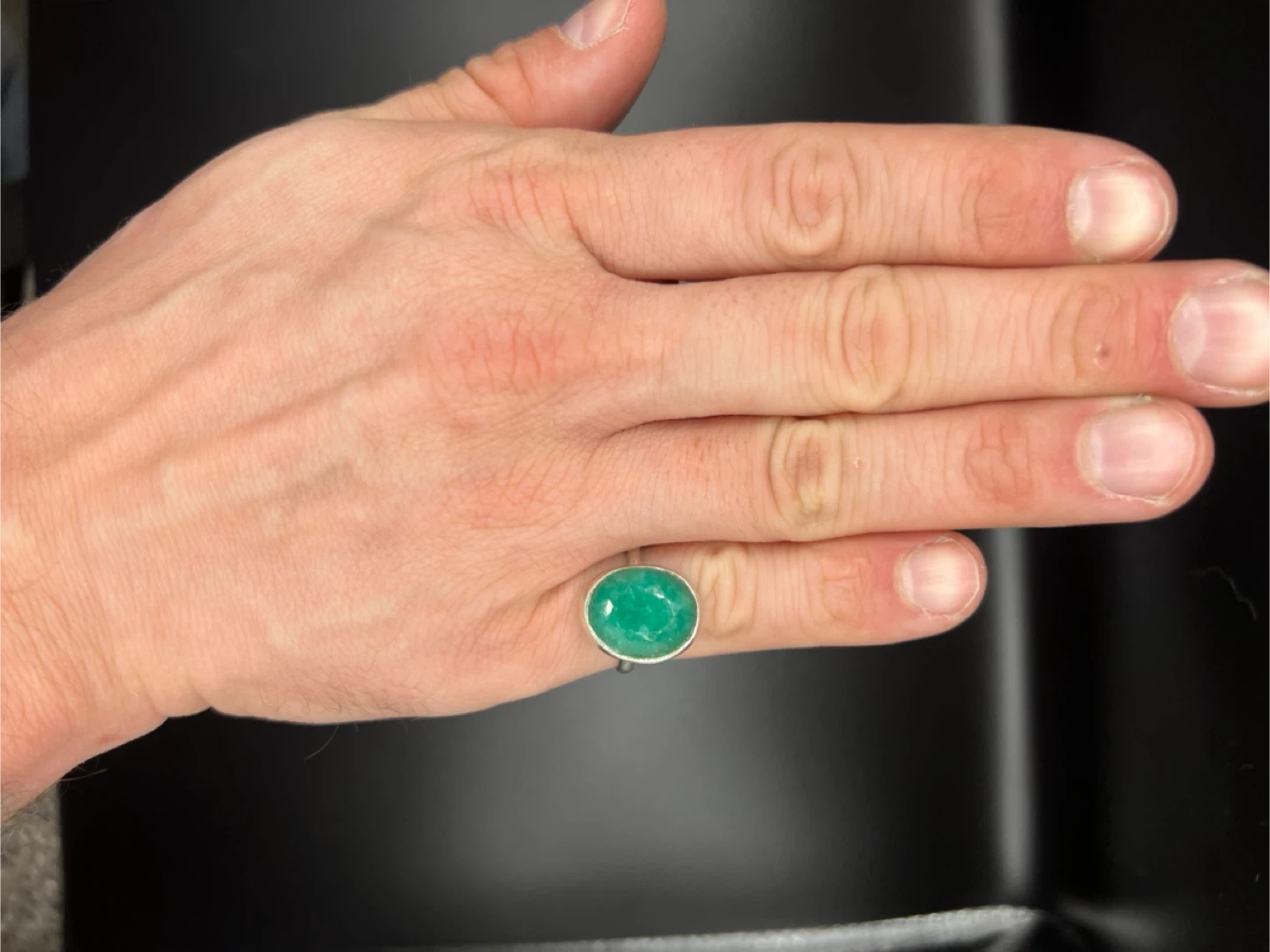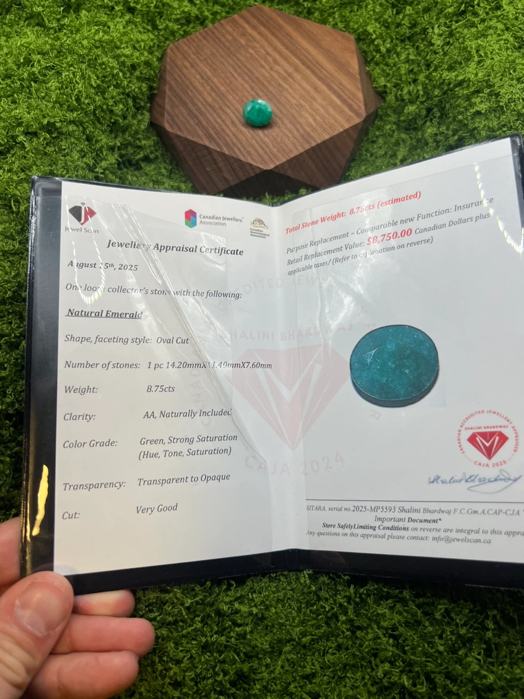 Selling a beautiful emerald ring. The stone is a natural emerald with an oval cut. It weighs 8.75 carats and has AA clarity, described as Naturally Included. The color grade is green with strong saturation. The appraisal certificate estimates a retail replacement value of $8,750.00 Canadian dollars